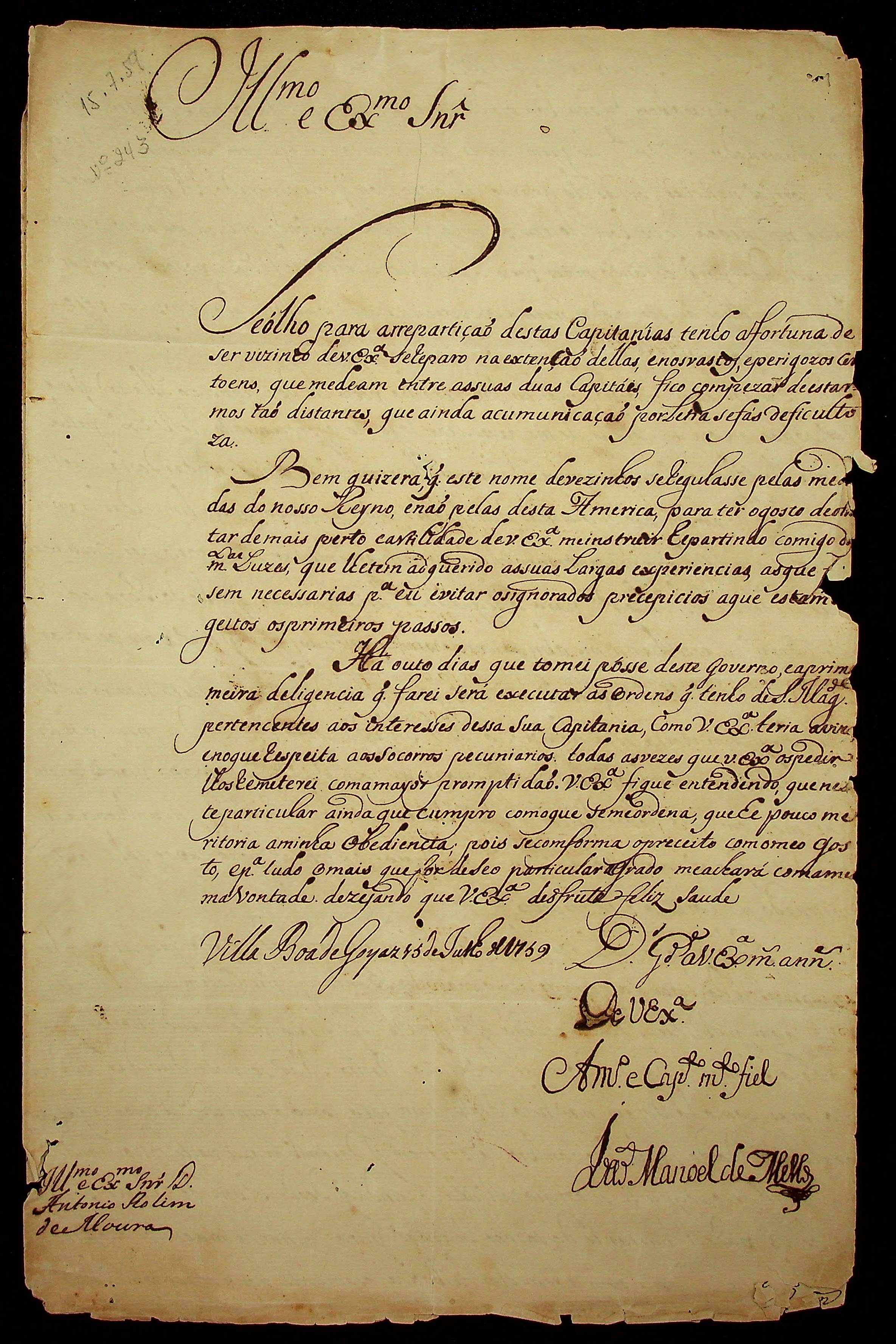 CARTA do [Governador e Capitão-General da Capitania de Goiás] João de Mello ao [Governador e Capitão-General da Capitania de Mato Grosso] Antônio Rolim de Moura.
