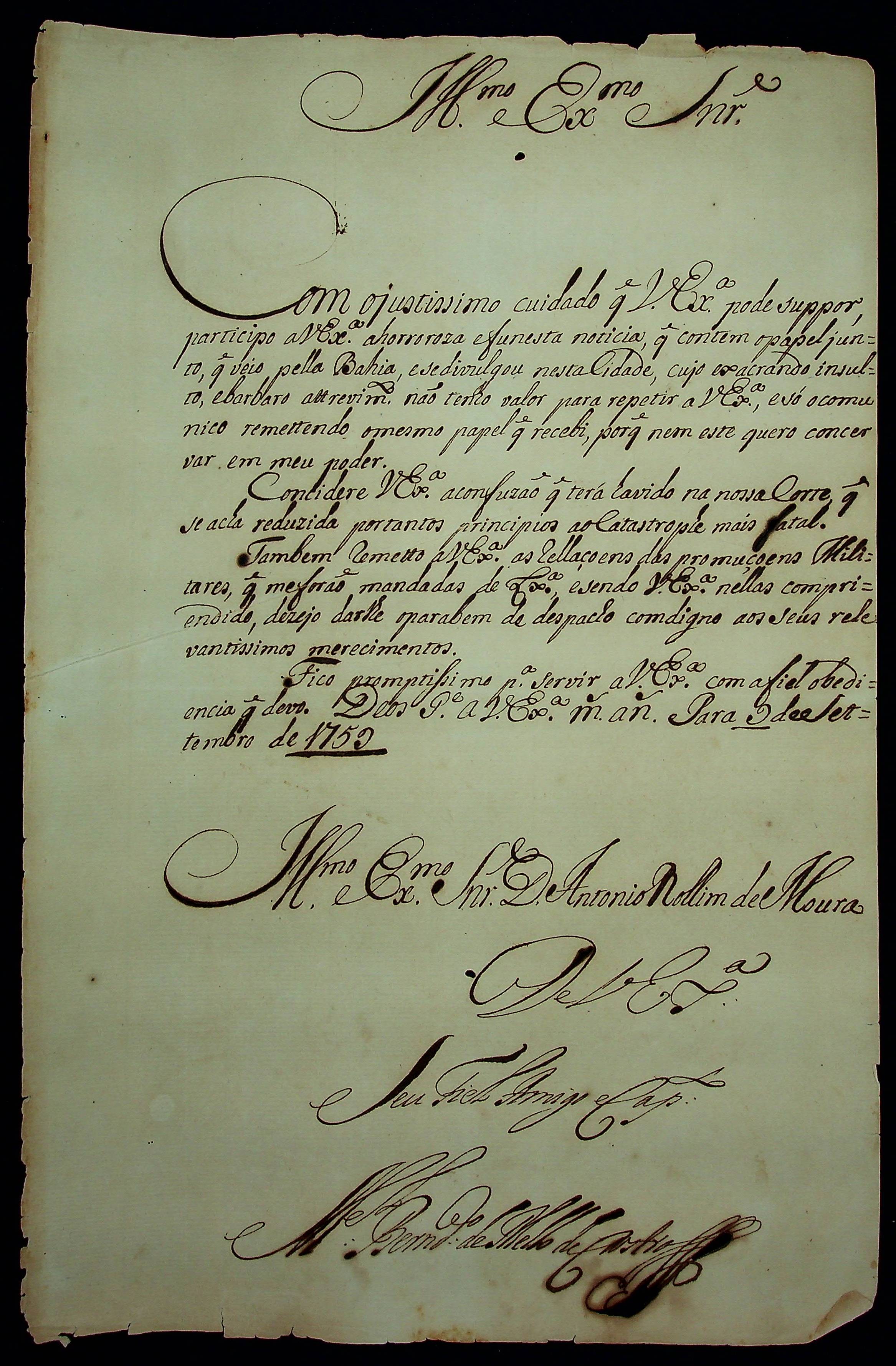 CARTA do [Governador e Capitão-General da Capitania do Grão Pará e Maranhão] Manoel Bernardo de Mello e Castro ao [Governador e Capitão-General da Capitania de Mato Grosso] Antônio Rolim de Moura.