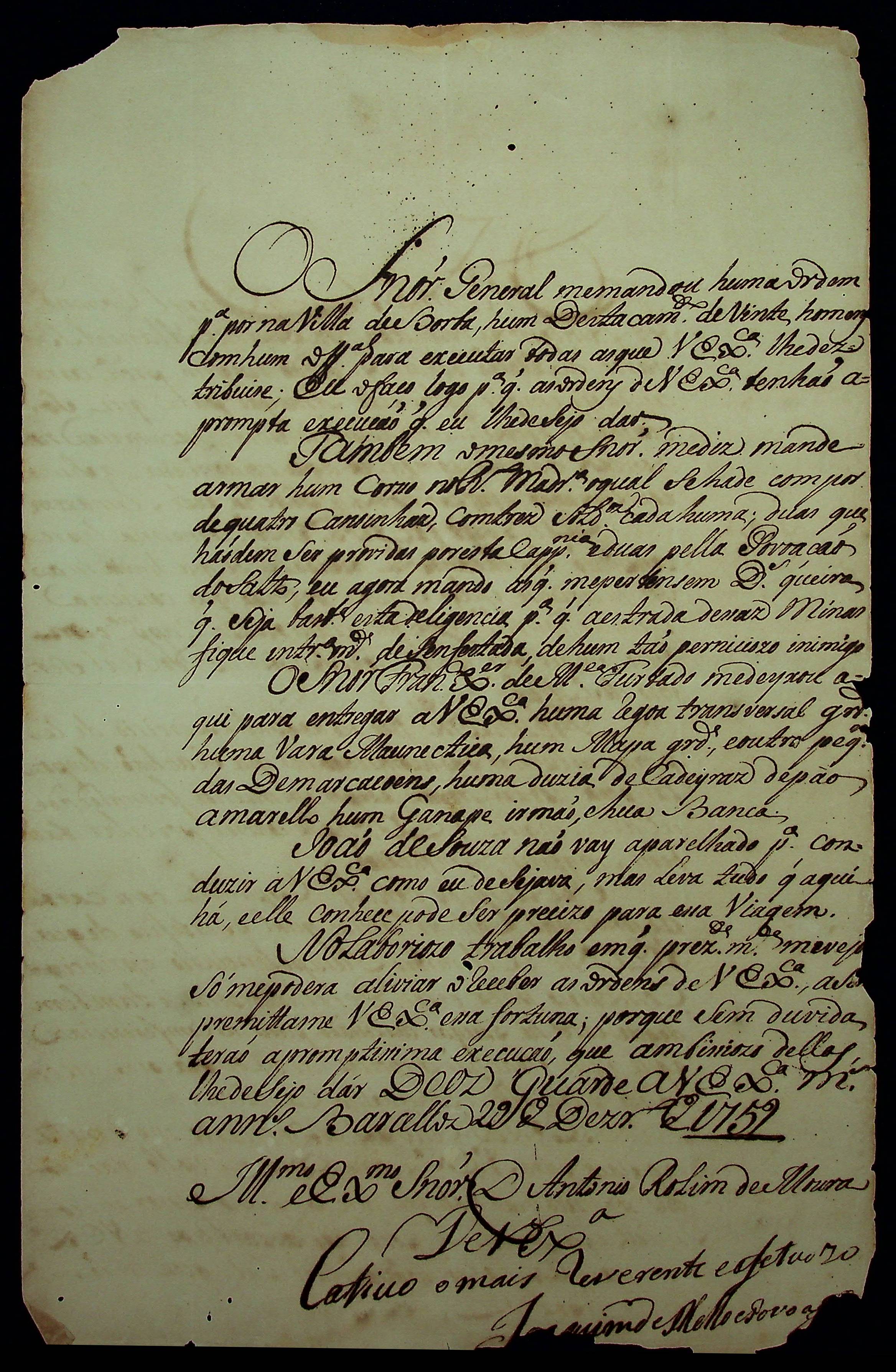 CARTA de Jerônimo de Mello ao [Governador e Capitão-General da Capitania de Mato Grosso] Antônio Rolim de Moura.