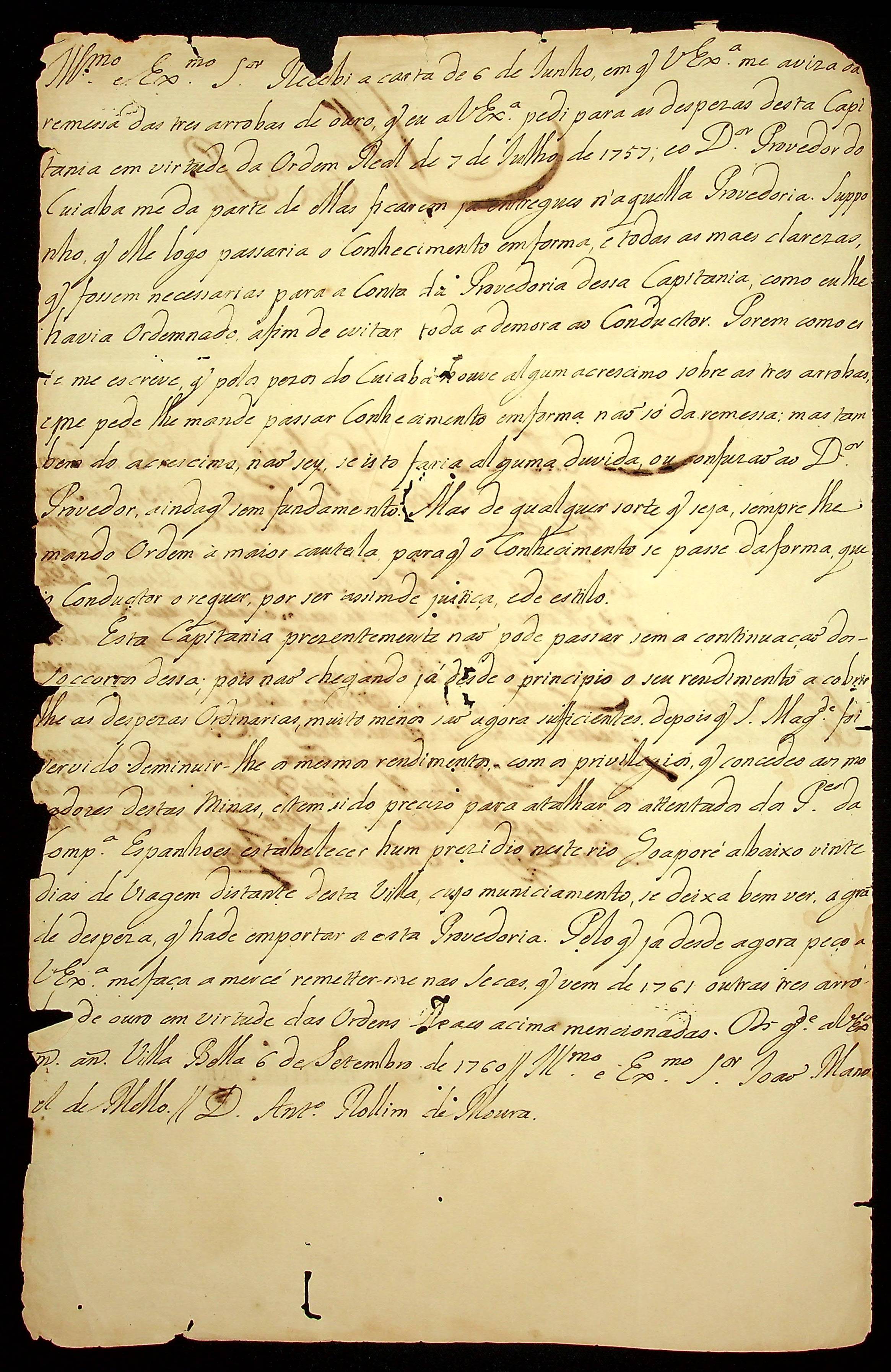 CARTA do [Governador e Capitão-General da Capitania de Goiás] João Manoel de Mello ao [Governador e Capitão General da Capitania de Mato Grosso] Antônio Rolim de Moura.