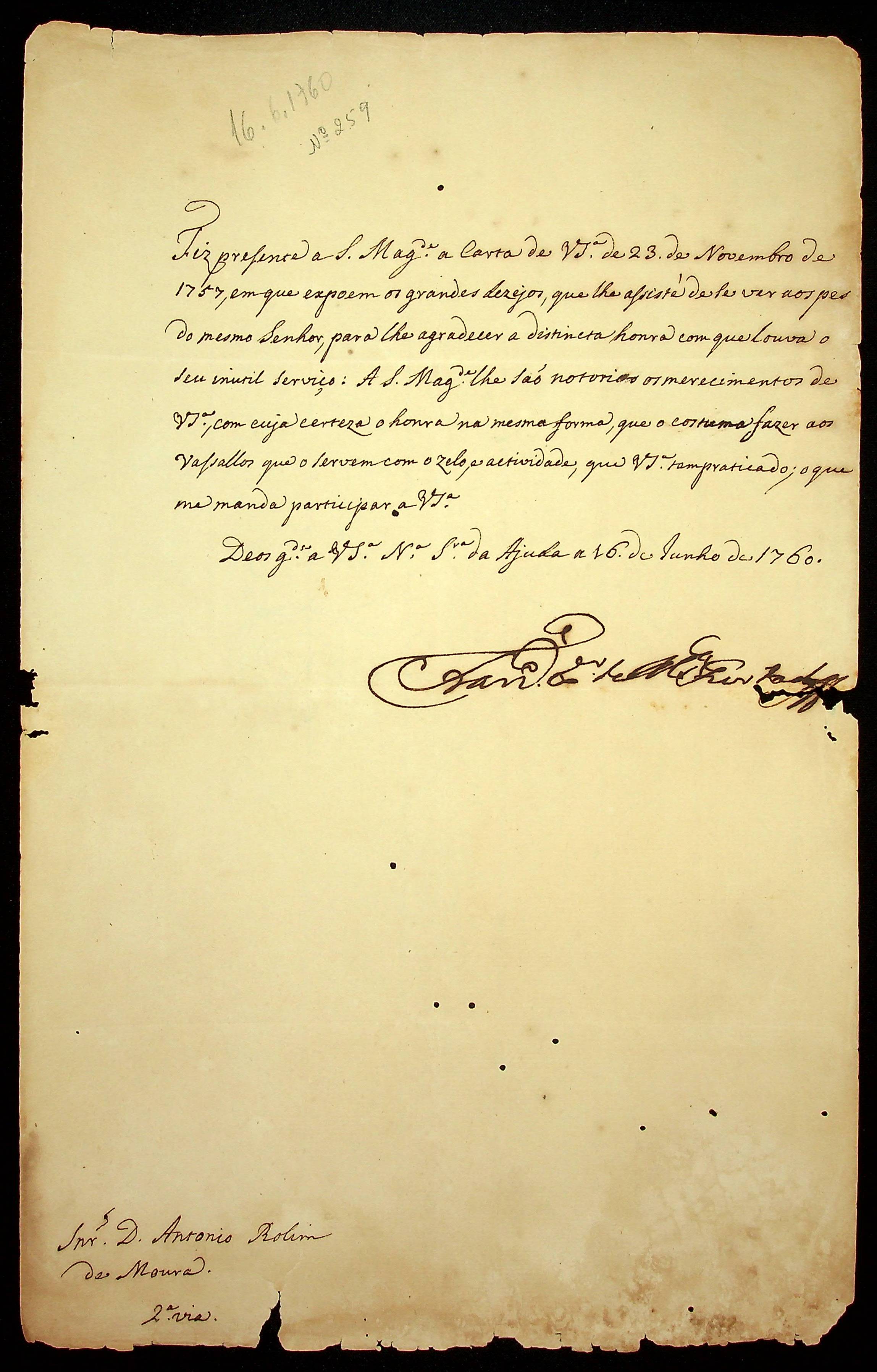 CARTA de Francisco Xavier de Mendonça Furtado ao [Governador e Capitão-General da Capitania de Mato Grosso] Antônio Rolim de Moura.