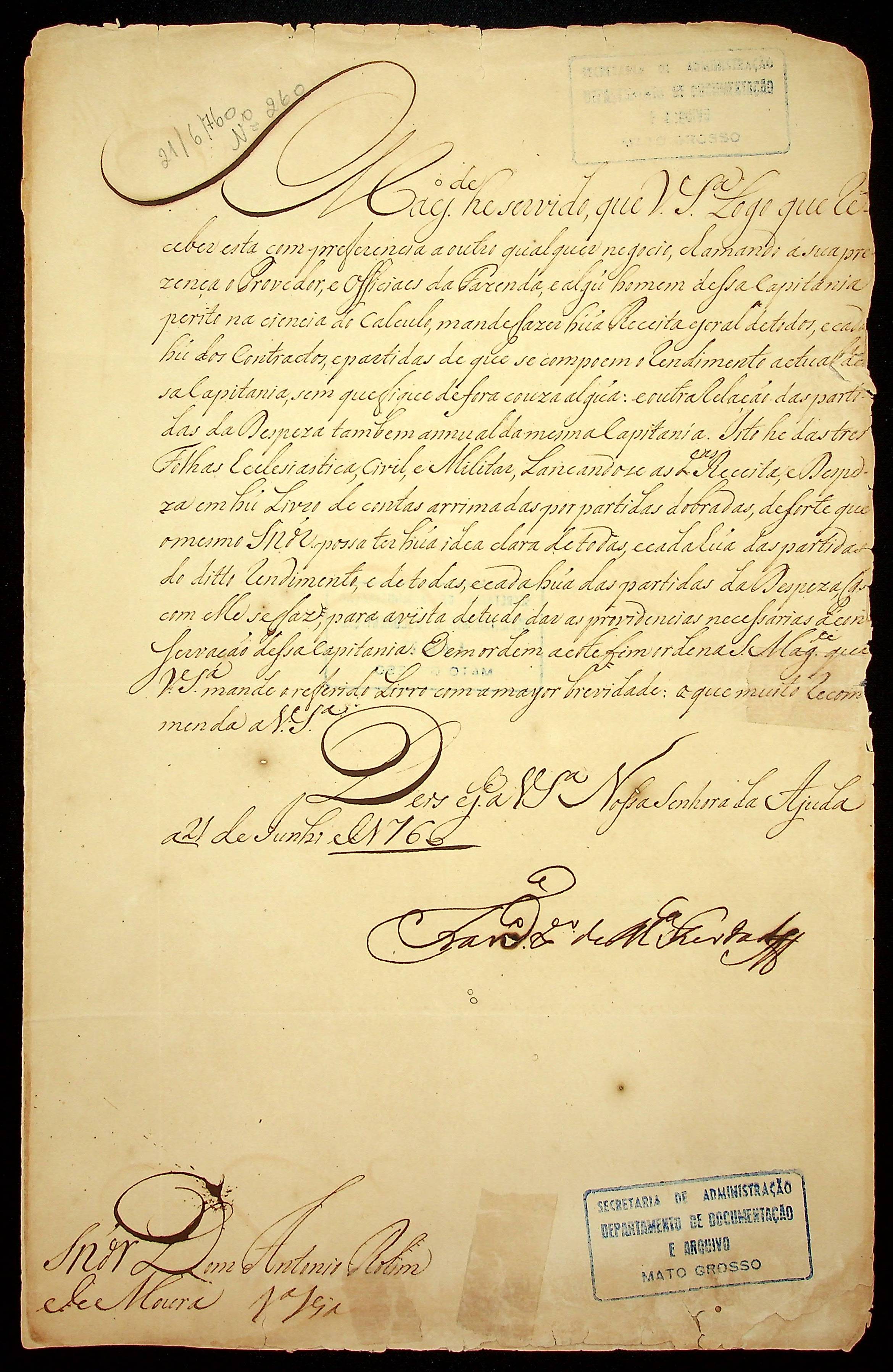 CARTA de Francisco Xavier de Mendonça Furtado ao [Governador e Capitão-General da Capitania de Mato Grosso] Antônio Rolim de Moura.