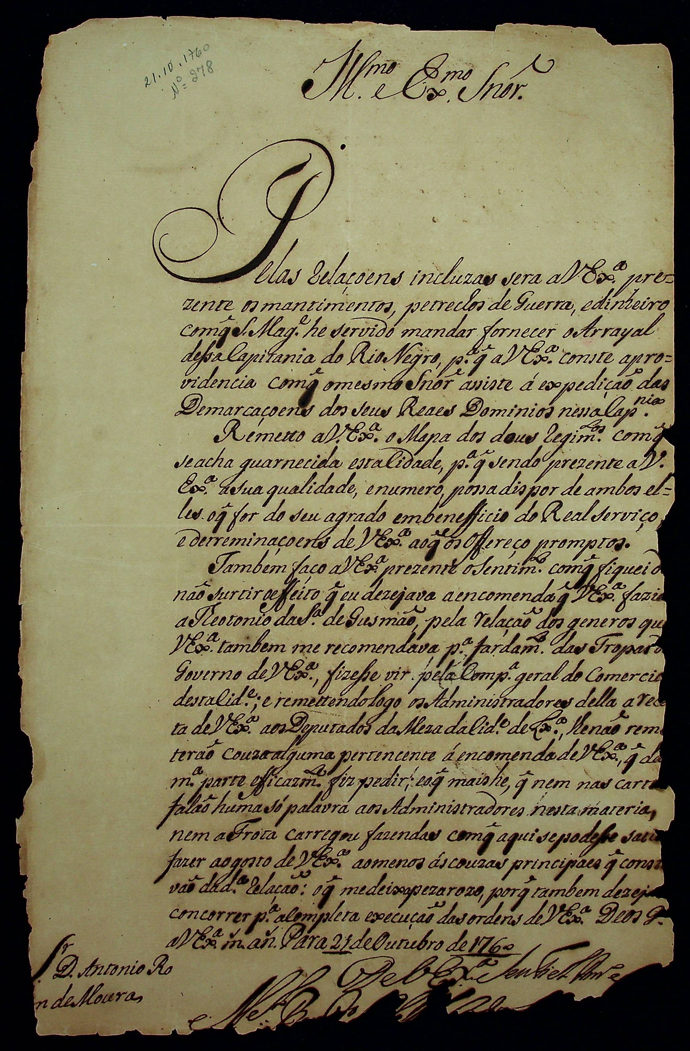 CARTA do [Governador e Capitão-General da Capitania do Grão-Pará e Maranhão] Manoel Bernardo de Mello e Castro ao [Governador e Capitão-General da Capitania de Mato Grosso] Antônio Rolim de Moura.