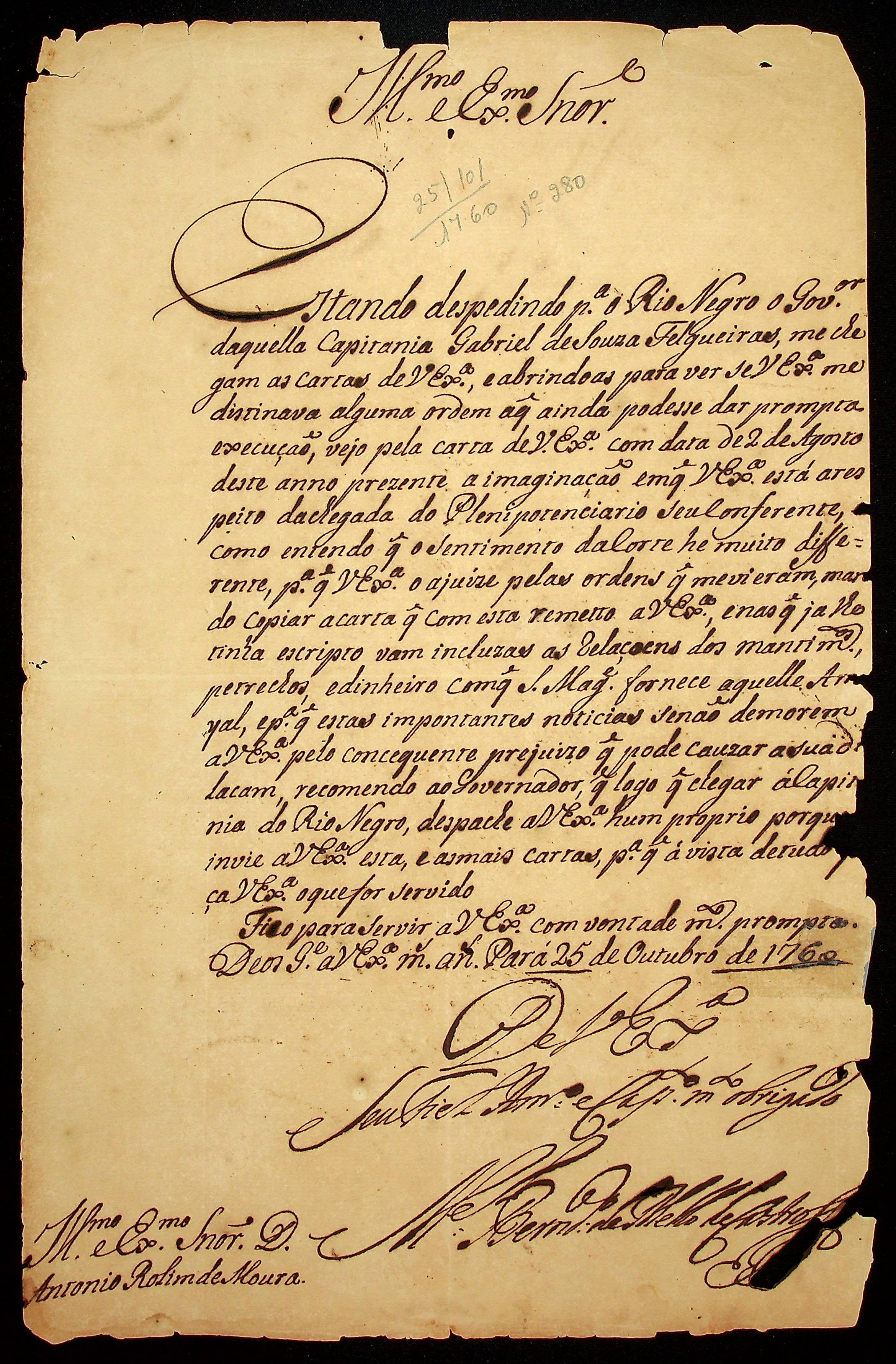 CARTA do [Governador e Capitão-General da Capitania do Grão-Pará e Maranhão] Manoel Bernardo de Mello de Castro ao [Governador e Capitão-General da Capitania de Mato Grosso] Antônio Rolim de Moura.