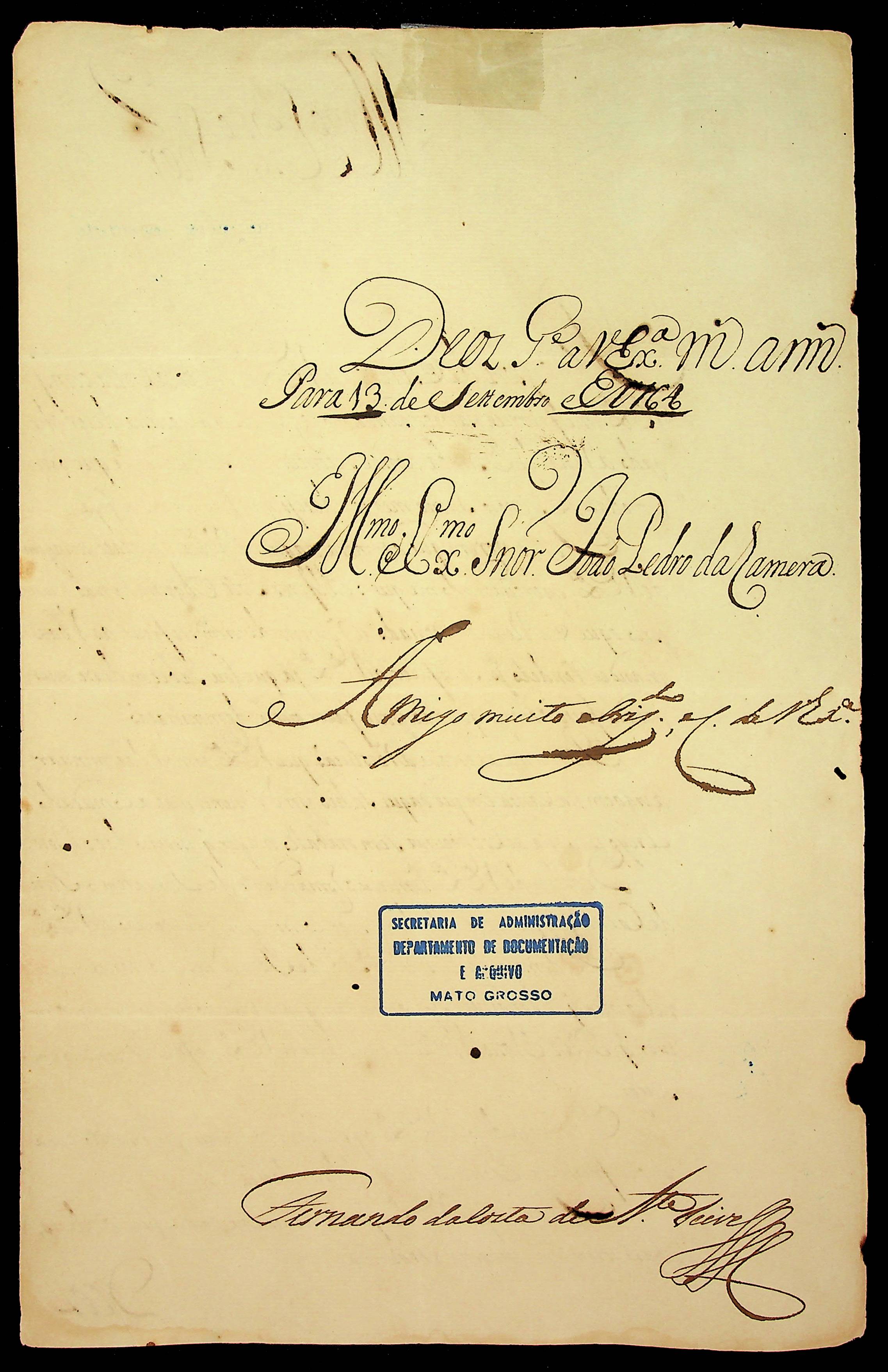 CARTA do [Governador e Capitão-General da Capitania do Grão Pará e Maranhão] Fernando da Costa de [Ataíde] Teive ao [Governador e Capitão-General da Capitania de Mato Grosso] João Pedro da Câmara.