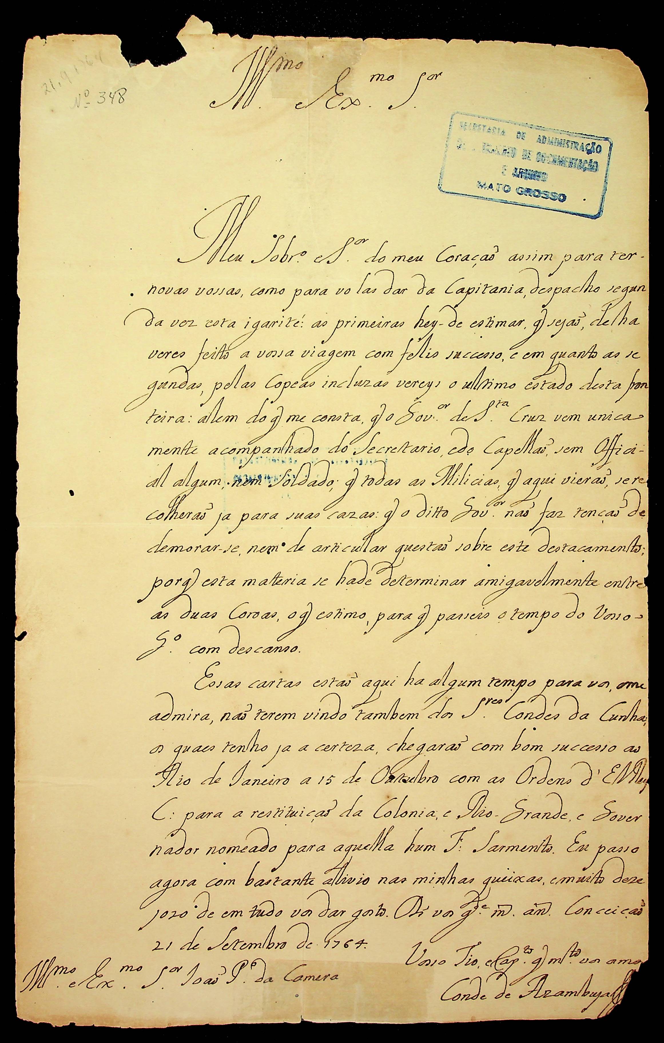 CARTA do Conde de Azambuja [Antônio Rolim de Moura] para o [Governador e Capitão-General da Capitania de Mato Grosso] João Pedro da Câmara.