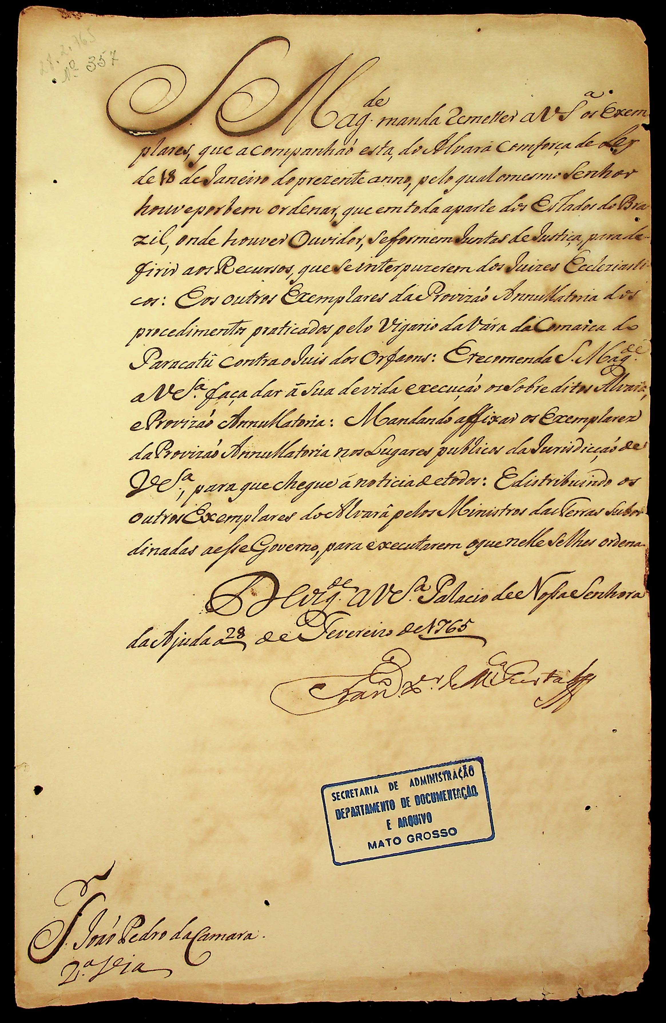 CARTA de Francisco Xavier de Mendonça Furtado ao [Governador e Capitão-General da Capitania de Mato Grosso] João Pedro da Câmara.