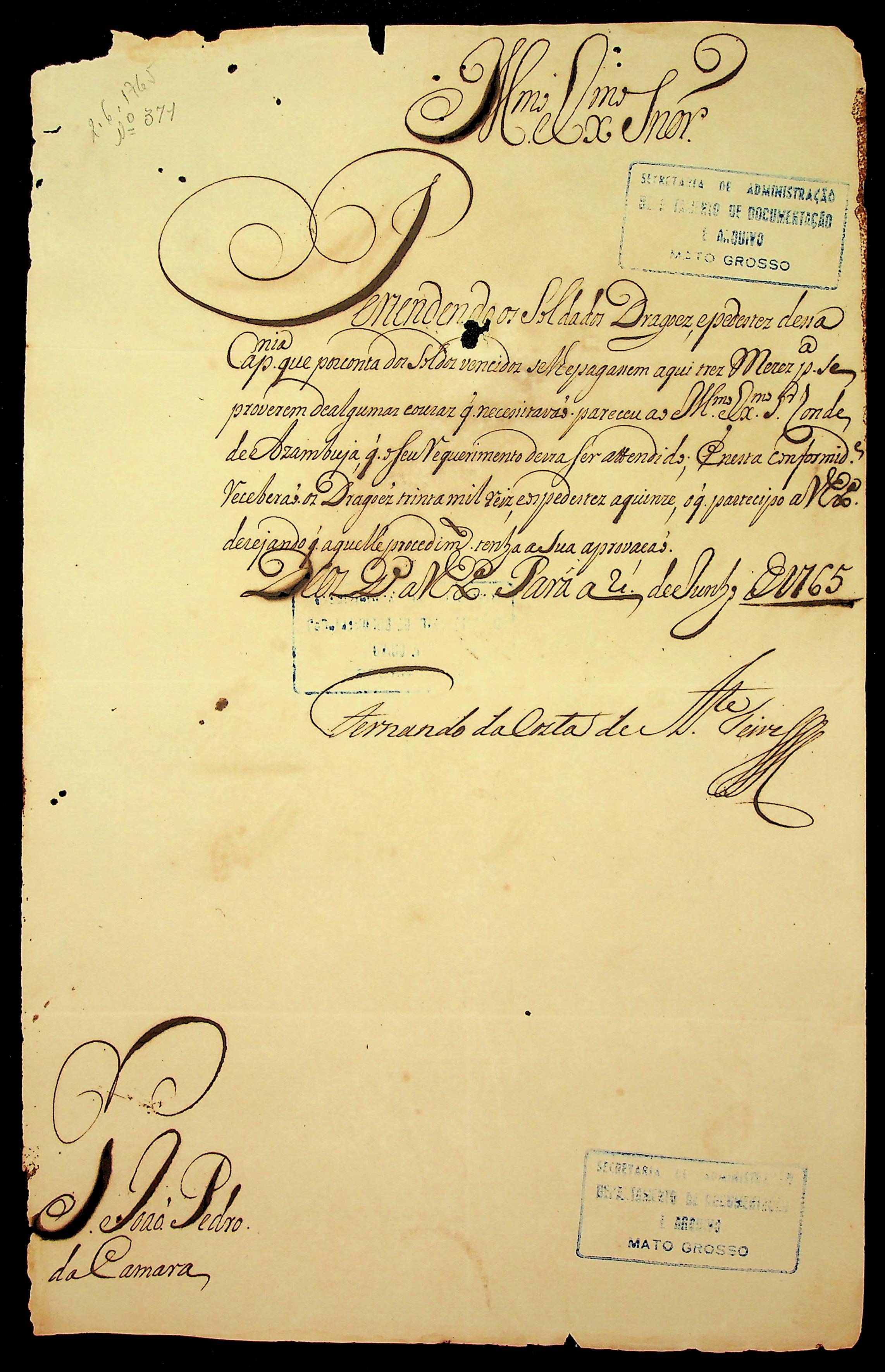 CARTA do [Governador e Capitão-General da Capitania do Grão Pará e Maranhão] Fernando da Costa [Ataíde] Teive ao [Governador e Capitão-General da Capitania de Mato Grosso] João Pedro da Câmara.