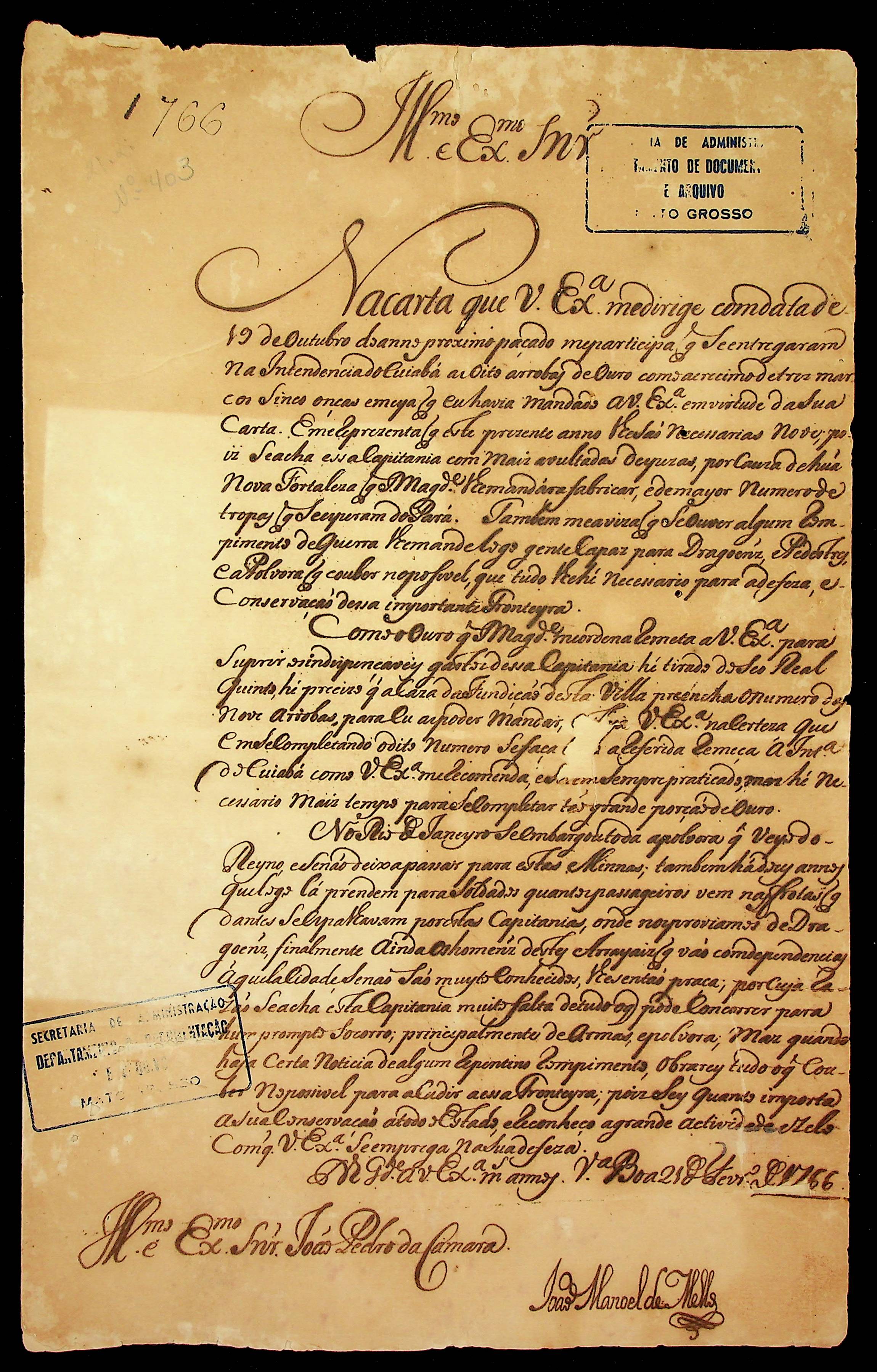 CARTA do [Governador e Capitão-General da Capitania de Goiás] João Manoel de Mello ao [Governador e Capitão-General da Capitania de Mato Grosso] João Pedro da Câmara.