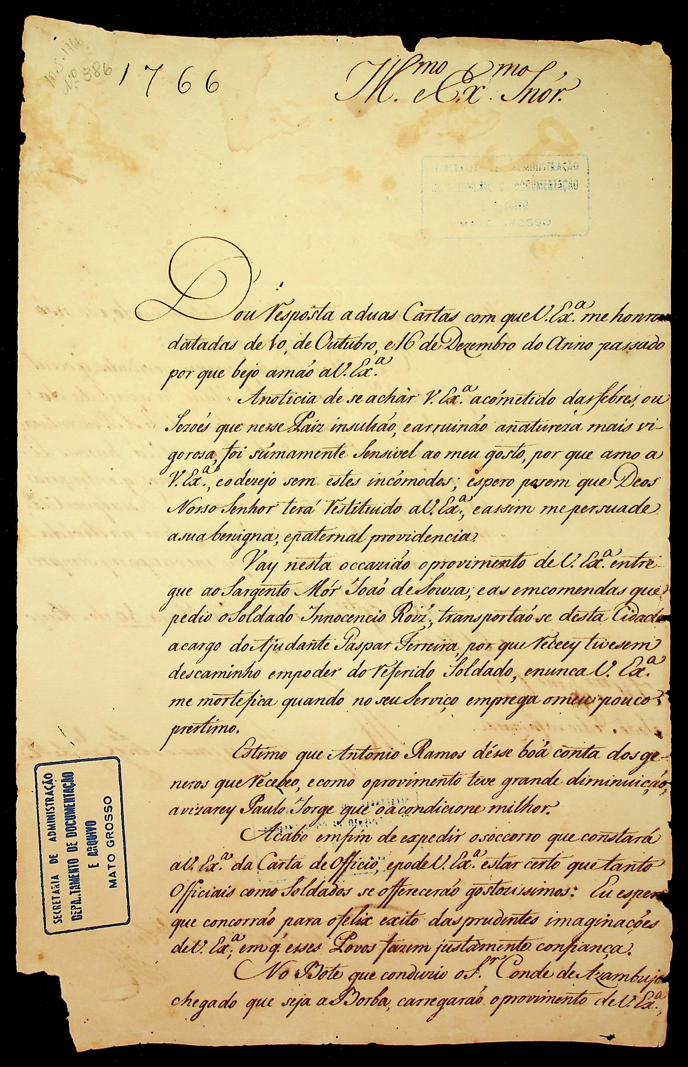 CARTA do [Governador e Capitão-General da Capitania do Grão Pará e Maranhão] Fernando da Costa de [Ataíde] Teive ao [Governador e Capitão-General da Capitania de Mato Grosso] João Pedro da Câmara.