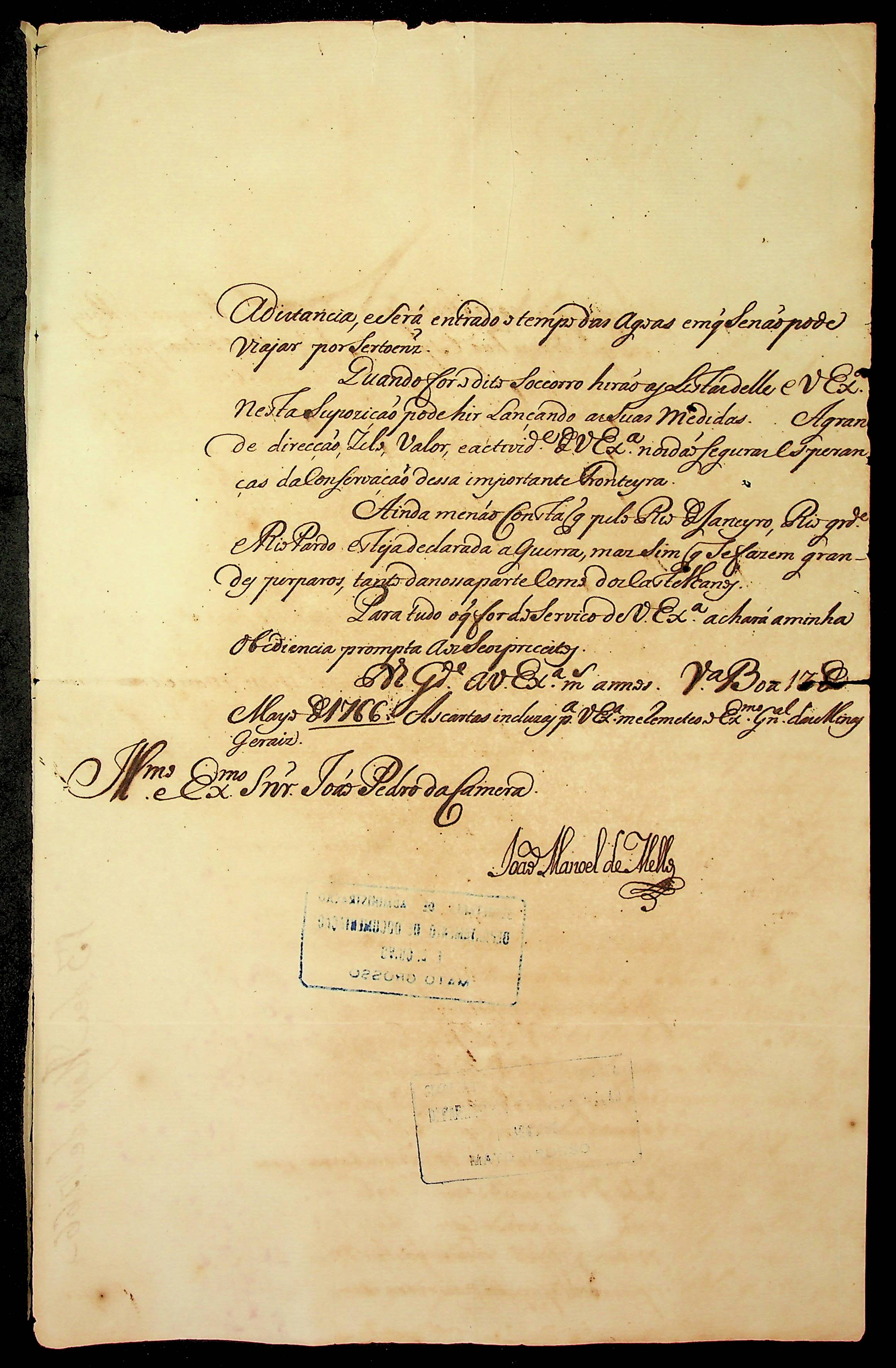 CARTA do [Governador e Capitão-General da Capitania de Goiás] João Manoel de Mello ao [Governador e Capitão-General da Capitania de Mato Grosso] João Pedro da Câmara.