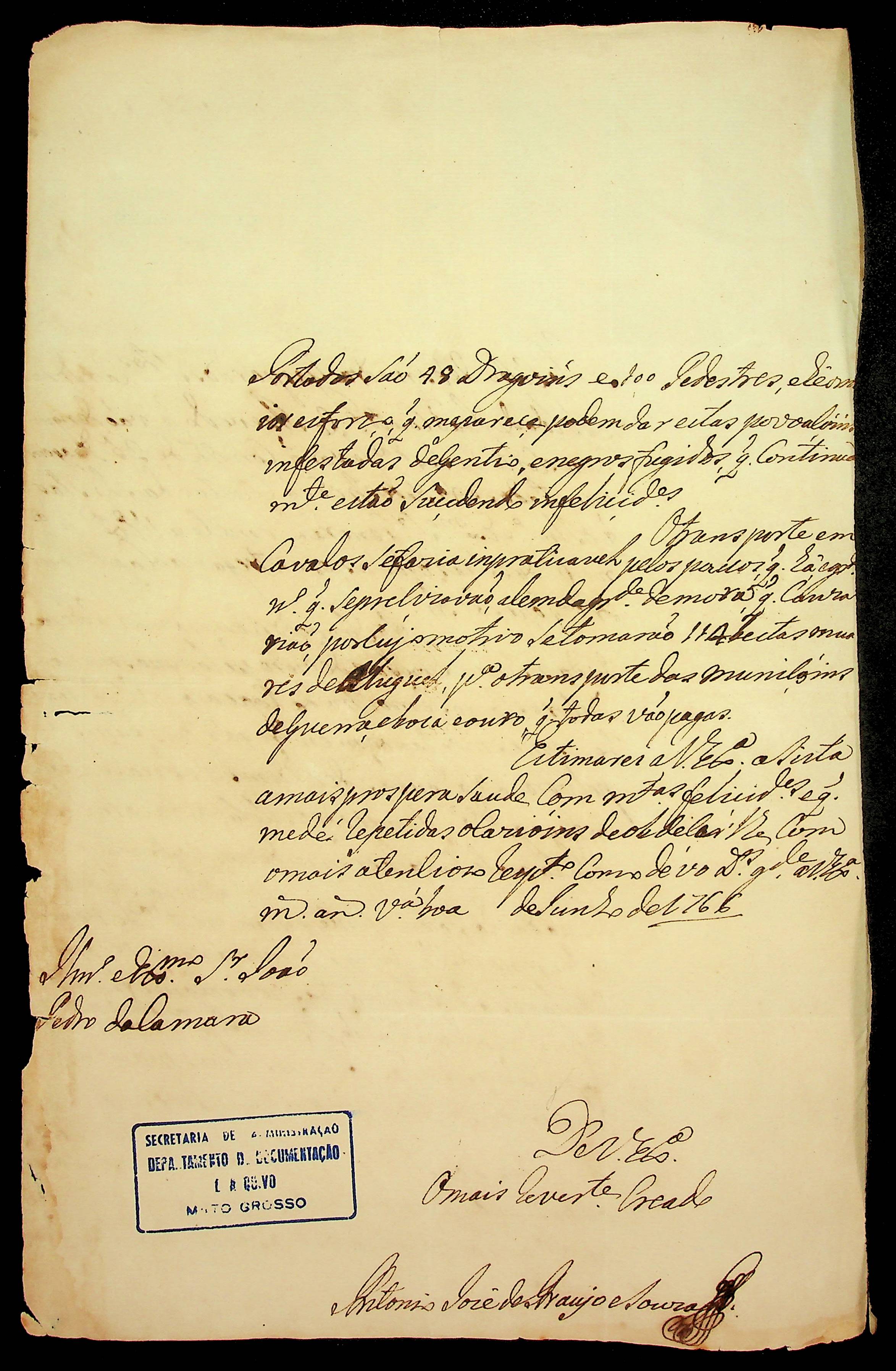 CARTA de Antônio José de Araújo Souza para o [Governador e Capitão-General da Capitania de Mato Grosso] João Pedro da Câmara.