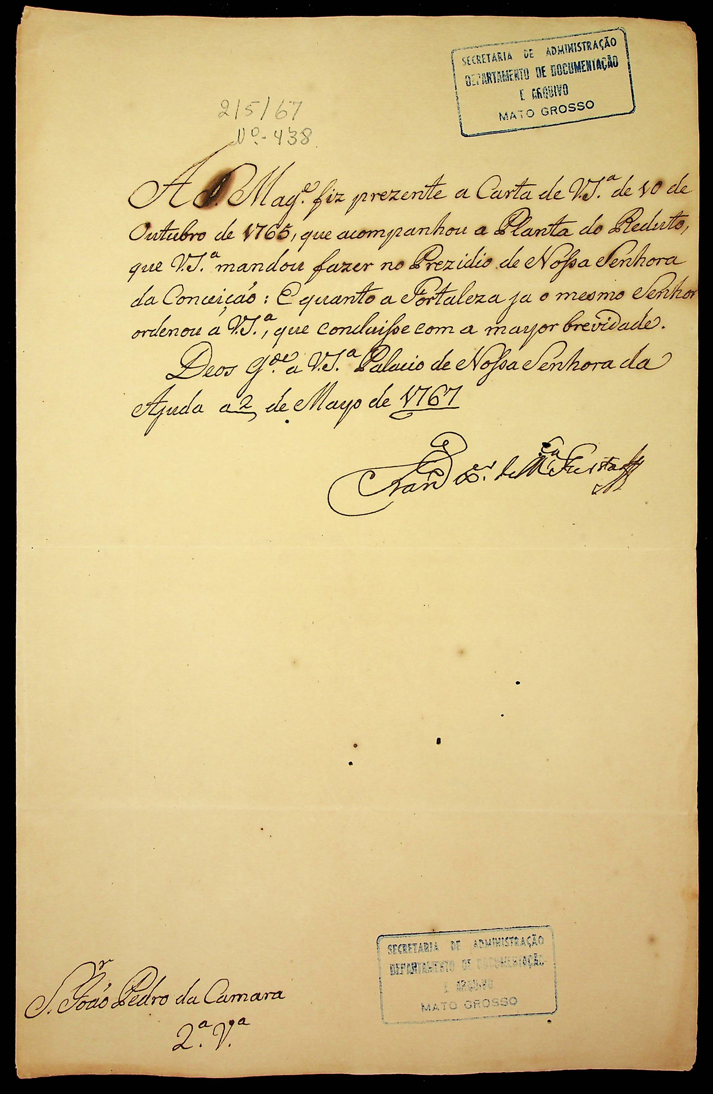 CARTA do Secretário do Palácio de Nossa Senhora da Ajuda Francisco Xavier Mendonça Furtado ao Governador e Capitão-General da Capitania de Mato Grosso João Pedro da Câmara.