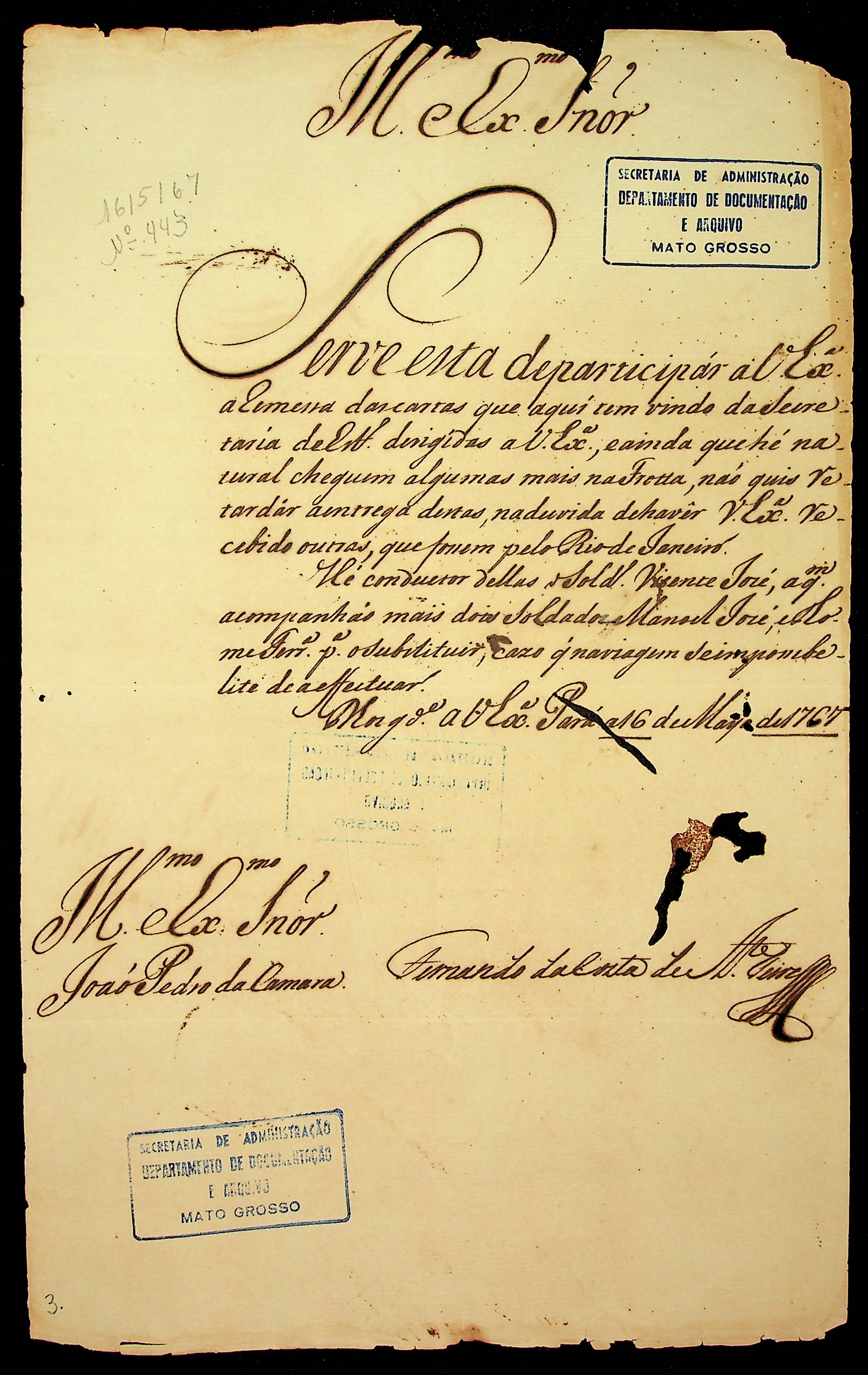 CARTA do [Governador e Capitão-General da Capitania do Grão Pará e Maranhão] Fernando da Costa de [Ataíde] Teive ao [Governador e Capitão-General da Capitania de Mato Grosso] João Pedro da Câmara.