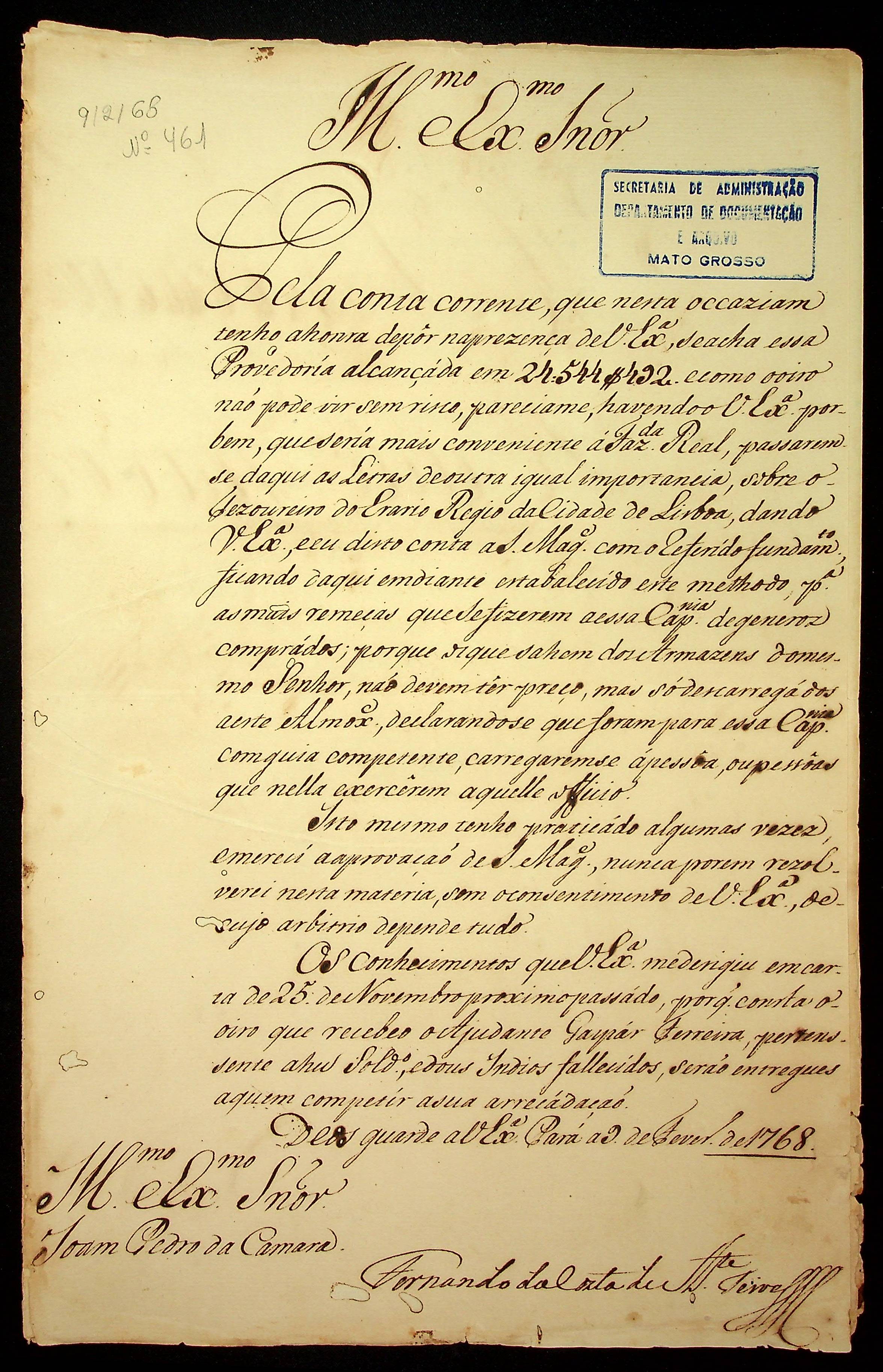 CARTA do [Governador e Capitão-General da Capitania do Grão Pará e Maranhão] Fernando da Costa de [Ataíde] Teive ao [Governador e Capitão-General da Capitania de Mato Grosso] João Pedro da Câmara.