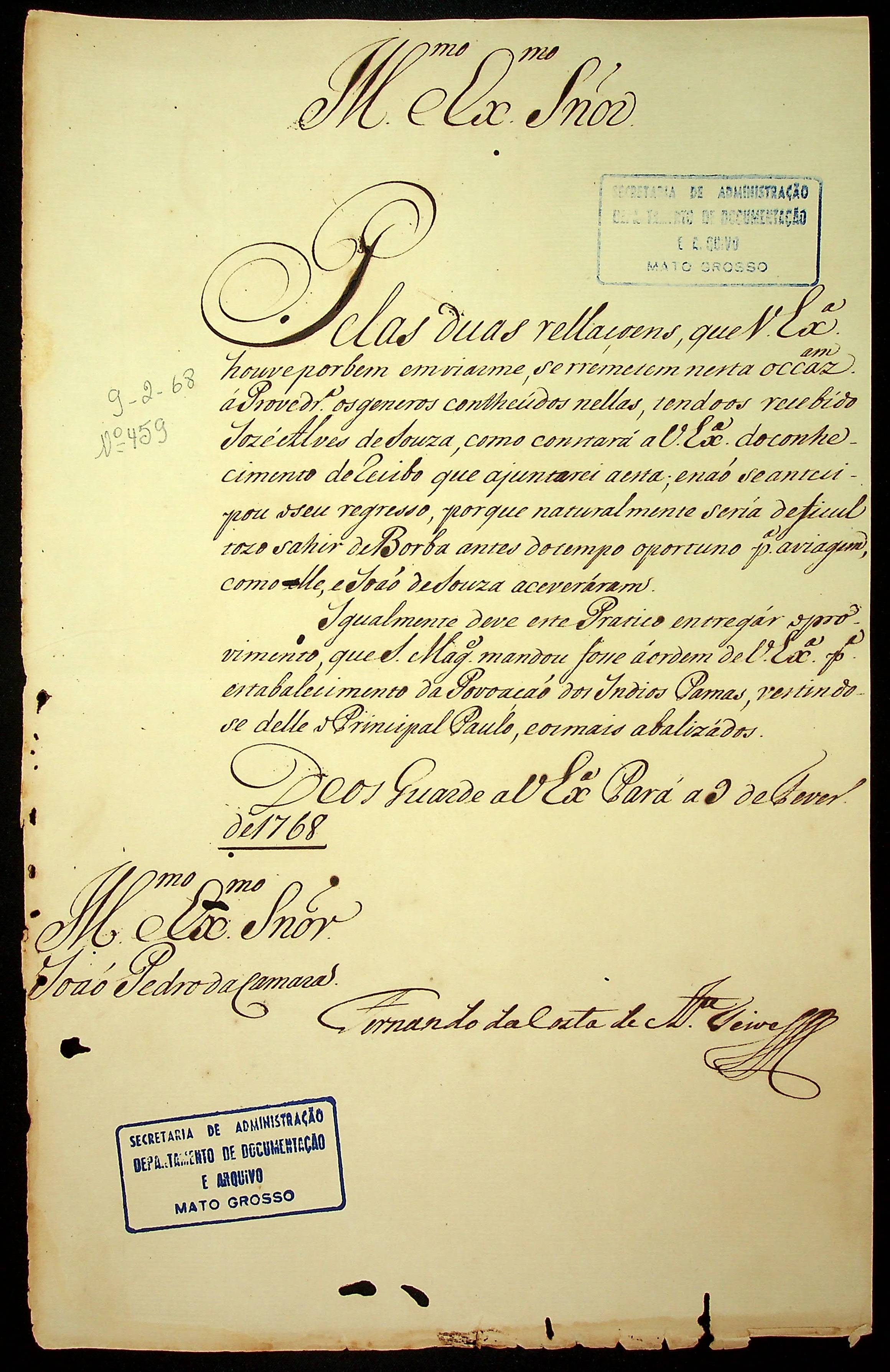 CARTA do [Governador e Capitão-General da Capitania do Grão Pará e Maranhão] Fernando da Costa de [Ataíde] Teive ao [Governador e Capitão-General da Capitania de Mato Grosso] João Pedro da Câmara.