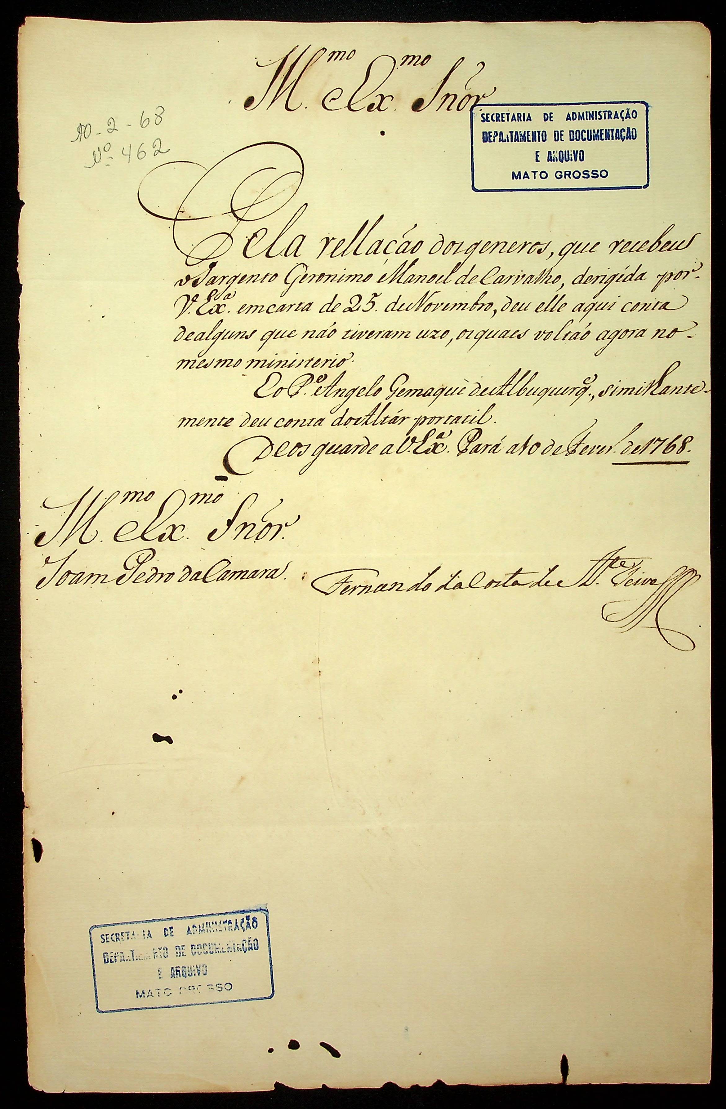 CARTA do [Governador e Capitão-General da Capitania do Grão Pará e Maranhão] Fernando da Costa de [Ataíde] Teive ao [Governador e Capitão-General da Capitania de Mato Grosso] João Pedro da Câmara.