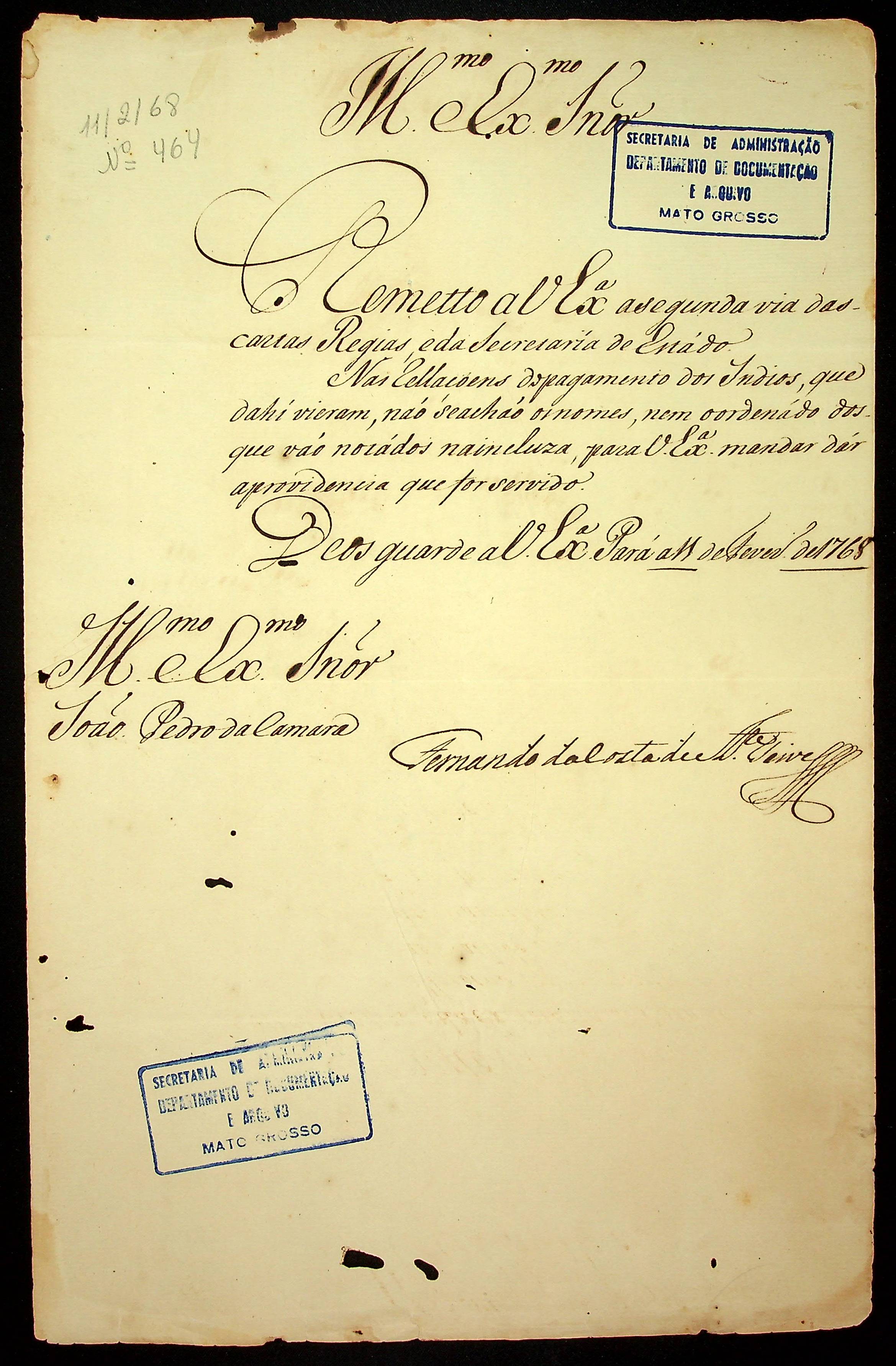 CARTA do [Governador e Capitão-General da Capitania do Grão Pará e Maranhão] Fernando da Costa de [Ataíde] Teive ao [Governador e Capitão-General da Capitania de Mato Grosso] João Pedro da Câmara.