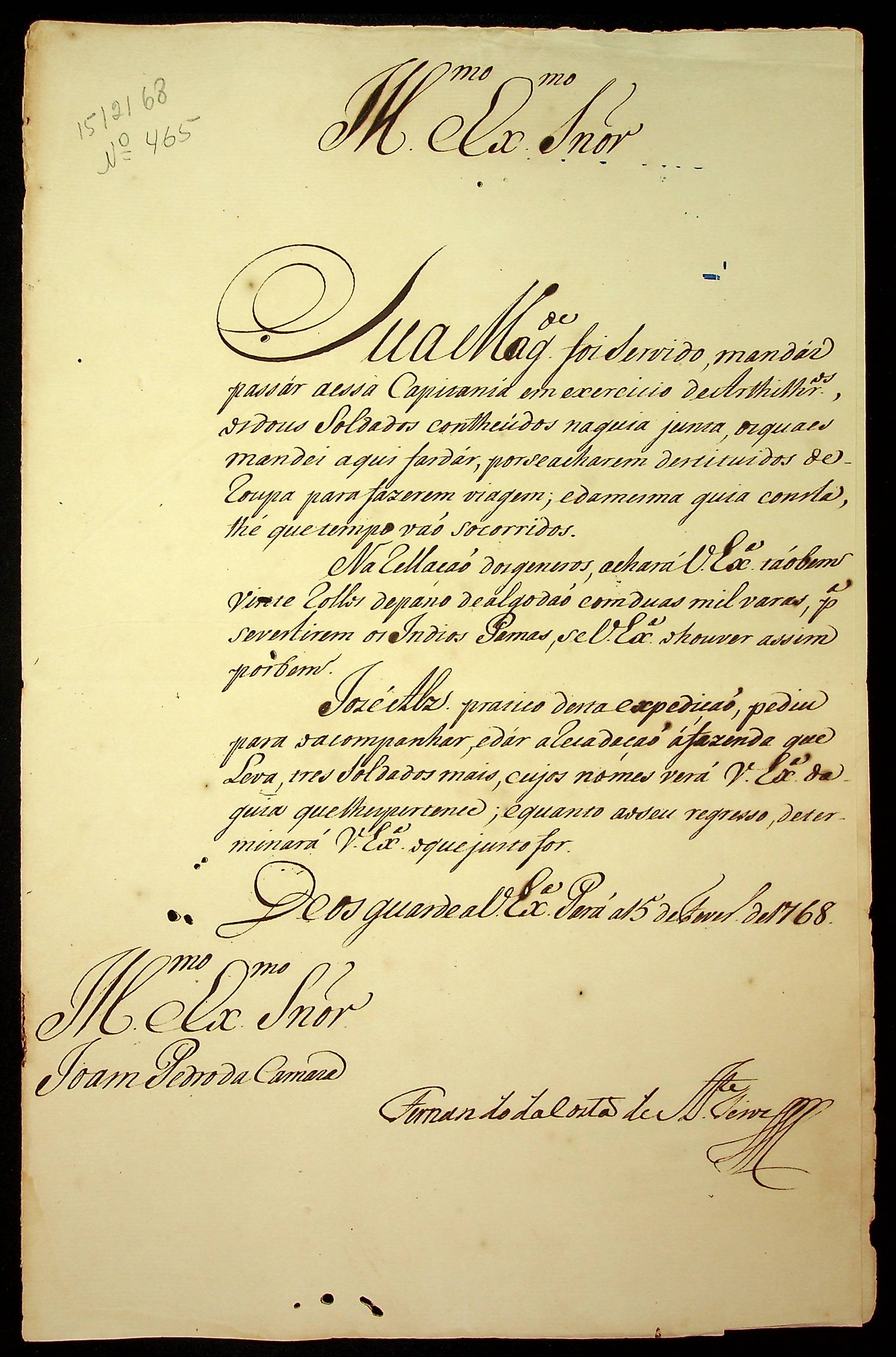 CARTA do [Governador e Capitão-General da Capitania do Grão Pará e Maranhão] Fernando da Costa de [Ataíde] Teive ao [Governador e Capitão-General da Capitania de Mato Grosso] João Pedro da Câmara.