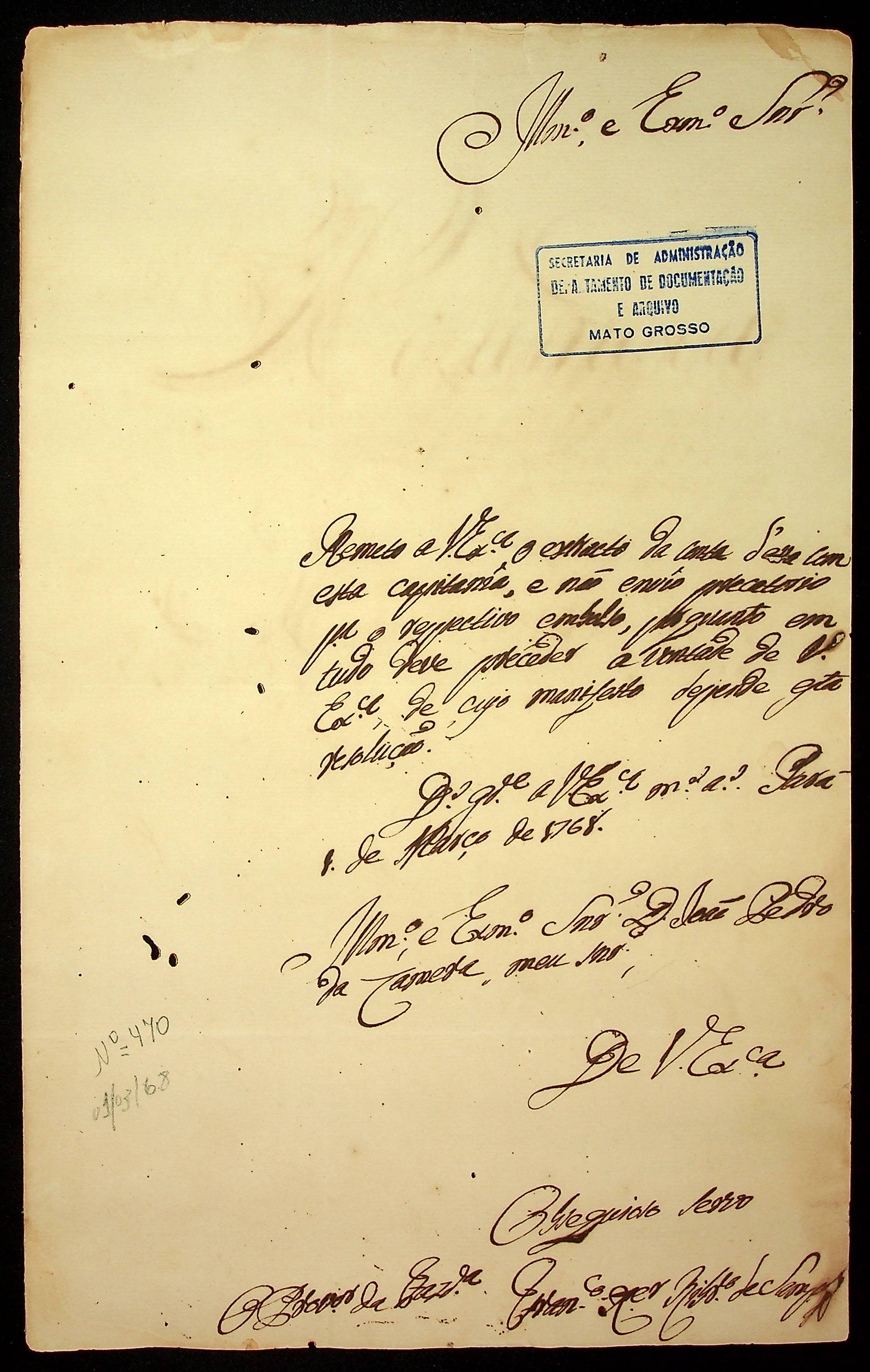 CARTA do Provedor da Fazenda Francisco Xavier Ribeiro de Sampaio ao [Governador e Capitão-General da Capitania de Mato Grosso] João Pedro da Câmara.