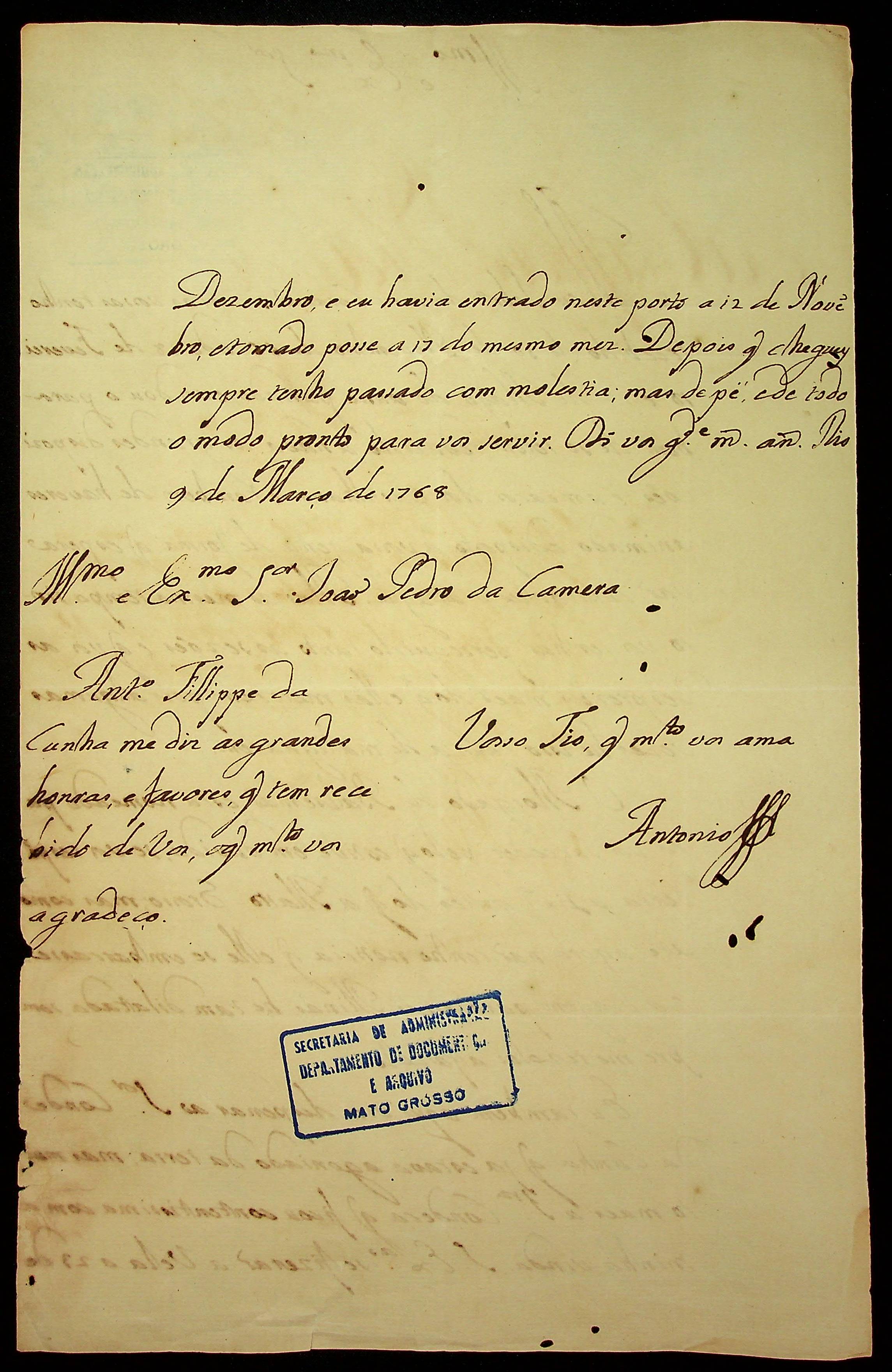 CARTA do [Governador e Capitão-General da Capitania do Grão Pará e Maranhão] Fernando da Costa de [Ataíde] Teive ao [Governador e Capitão-General da Capitania de Mato Grosso] João Pedro Câmara.
