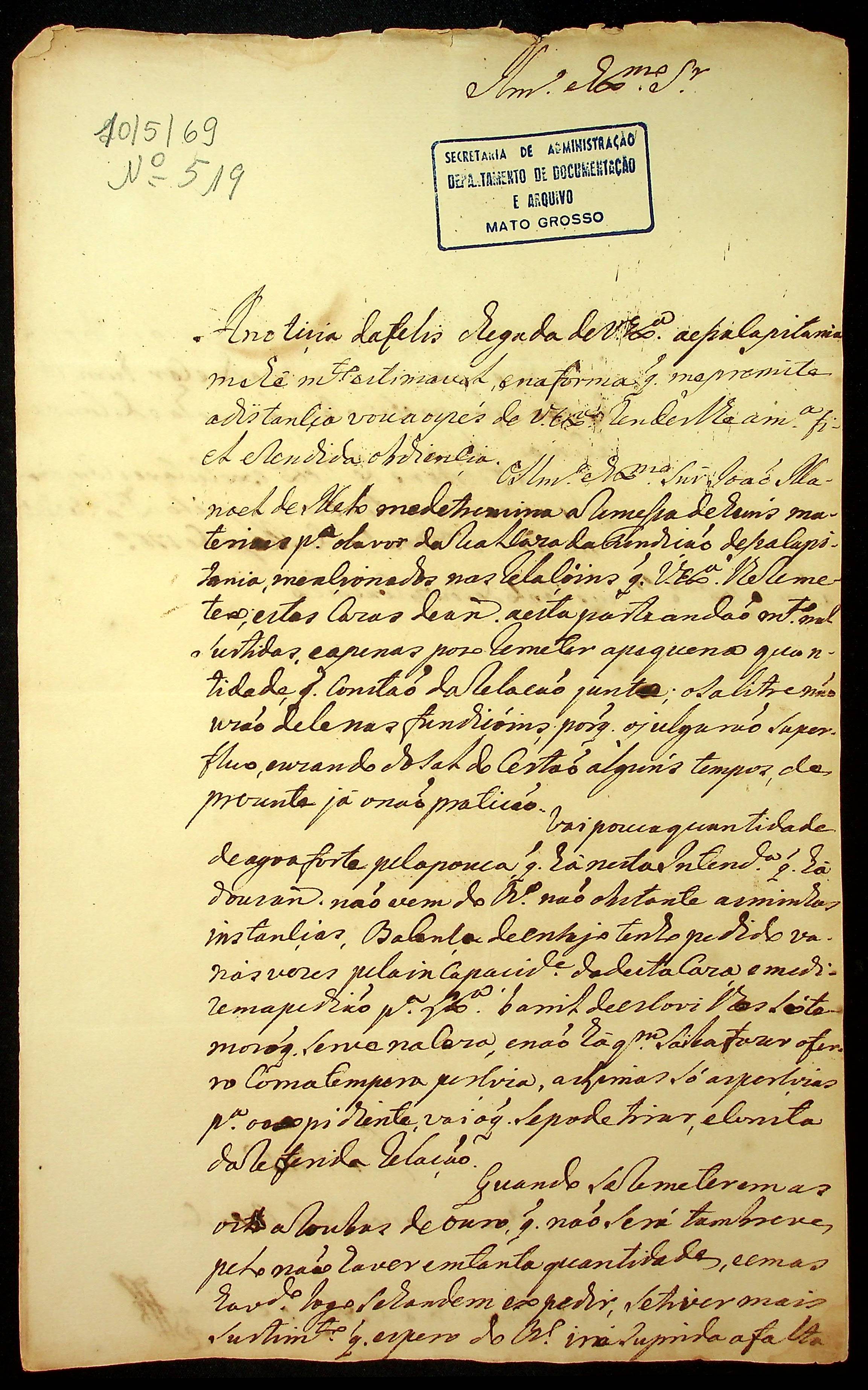 CARTA de Antônio José de Araújo e Souza ao [Governador e Capitão-General da Capitania de Mato Grosso] Luís Pinto de Souza Coutinho.