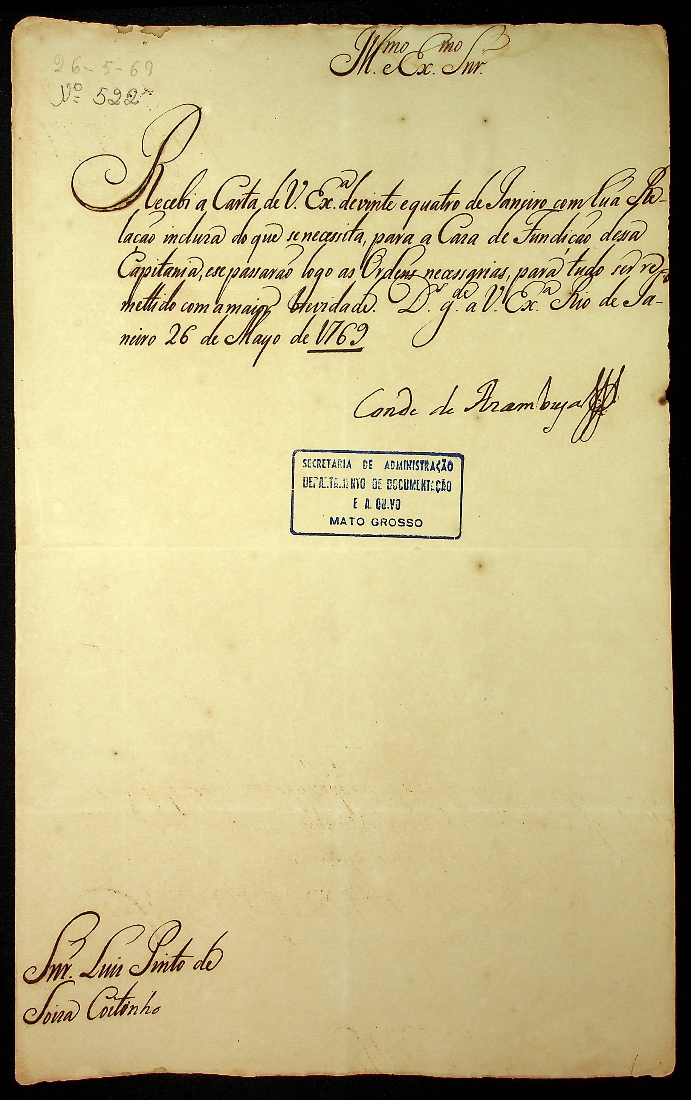 CARTA do Conde de Azambuja ao [Governador e Capitão-General da Capitania de Mato Grosso] Luís Pinto de Souza Coutinho.