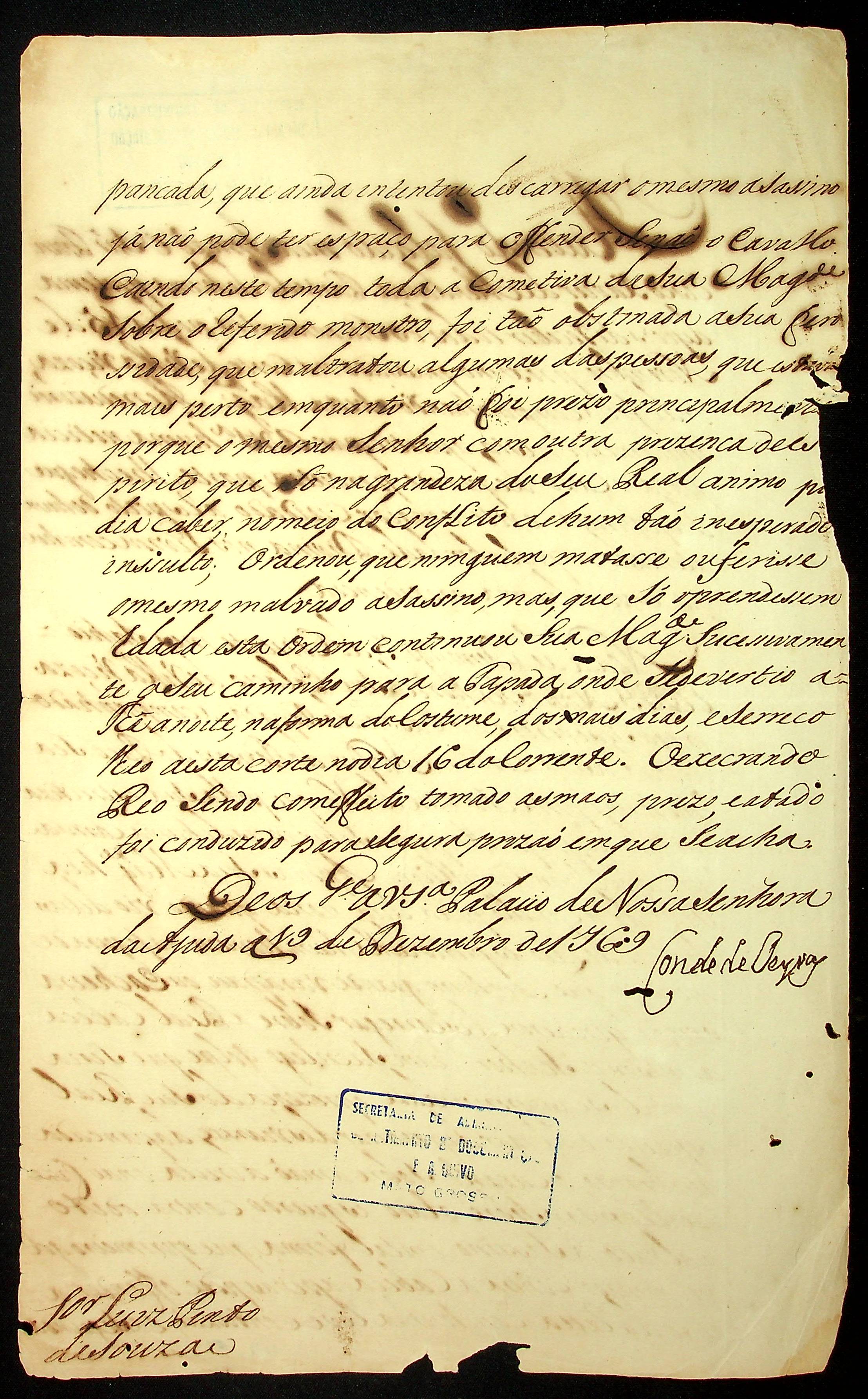 CARTA do Conde de Oeyras para [Governador e Capitão-General da Capitania de Mato Grosso] Luiz Pinto de Souza [Coutinho].