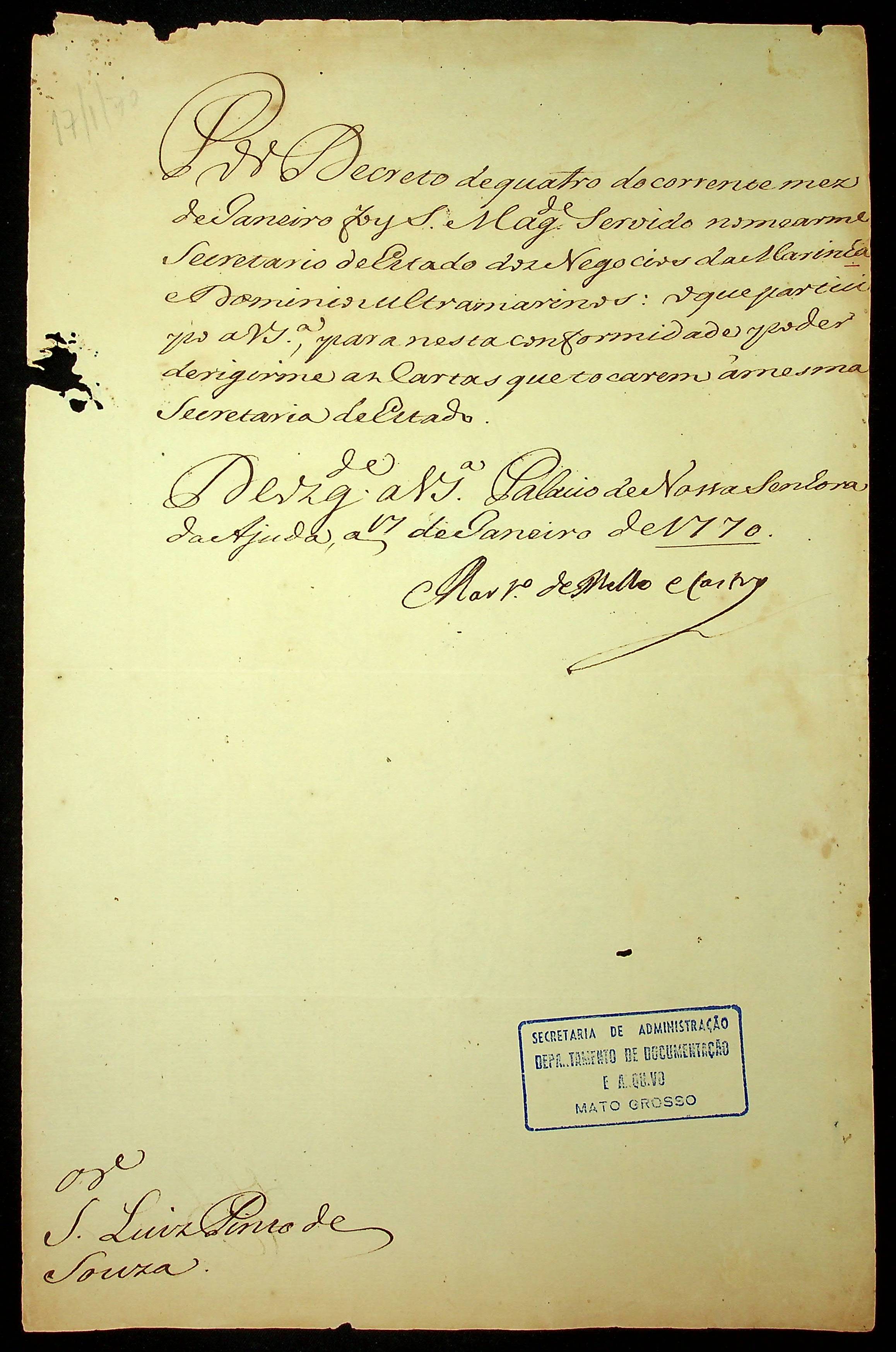 CARTA do Secretário de Estado dos Negócios da Marinha e Domínio Ultramarino Martinho de Mello Castro ao [Governador e Capitão-General da Capitania de Mato Grosso] Luís Pinto de Souza Coutinho.