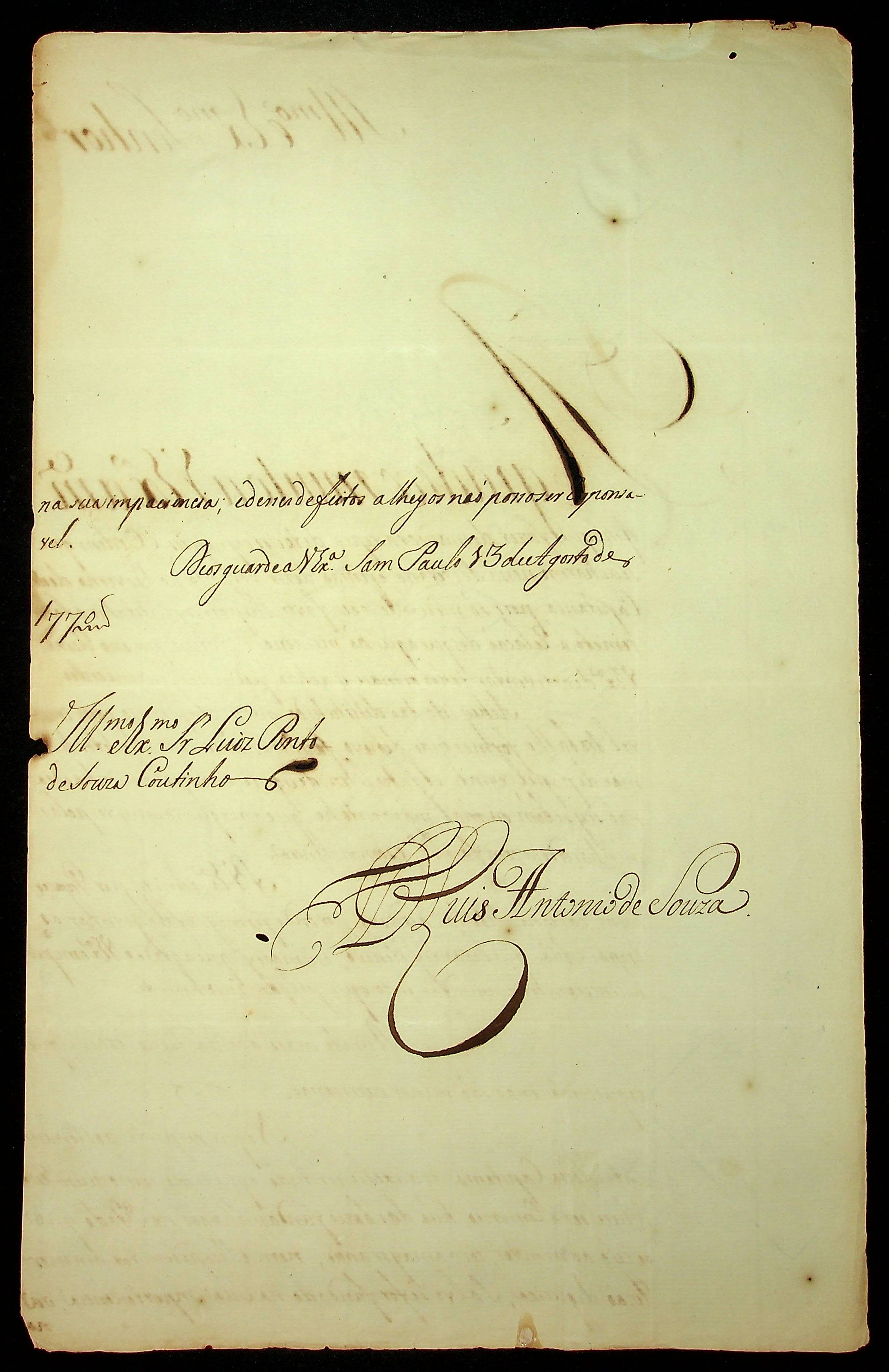 CARTA de [Governador e Capitão-General da Capitania de Mato Grosso] Luís Antônio de Souza ao [Governador e Capitão-General da Capitania de Mato Grosso] Luís Pinto de Souza Coutinho.