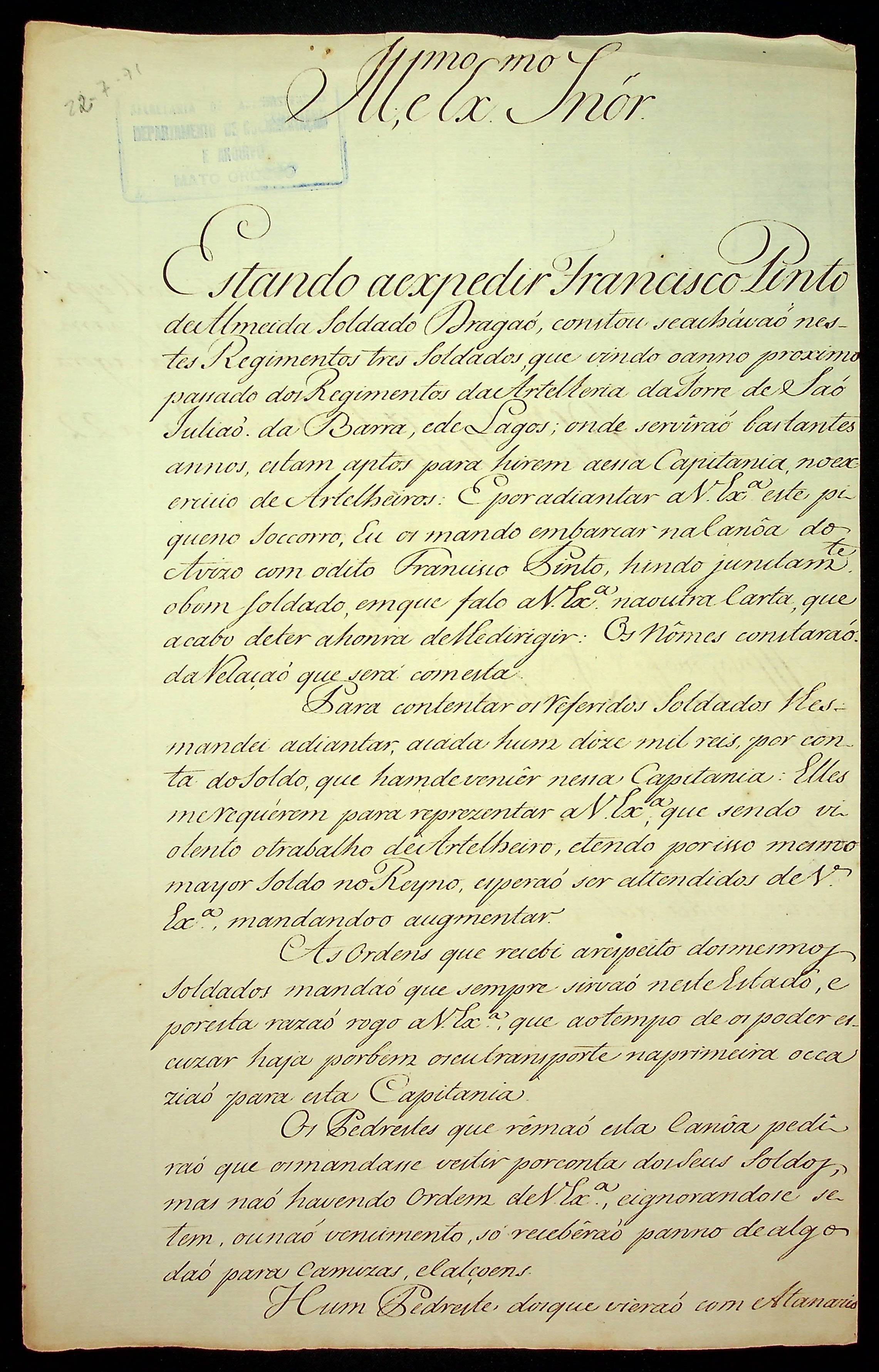 CARTA do [Governador e Capitão-General da Capitania do Grão Pará e Maranhão] Fernando da Costa de [Ataíde] Teive ao [Governador e Capitão-General da Capitania de Mato Grosso] Luís Pinto de Souza Coutinho.