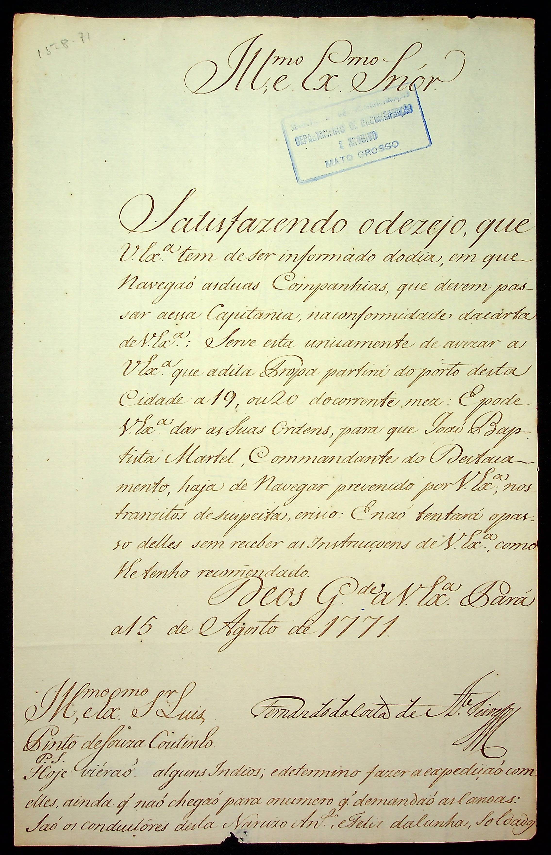 CARTA do [Governador e Capitão-General da Capitania do Grão Pará e Maranhão] Fernando da Costa de [Ataíde] Teive ao [Governador e Capitão-General da Capitania de Mato Grosso] Luís Pinto de Souza Coutinho.
