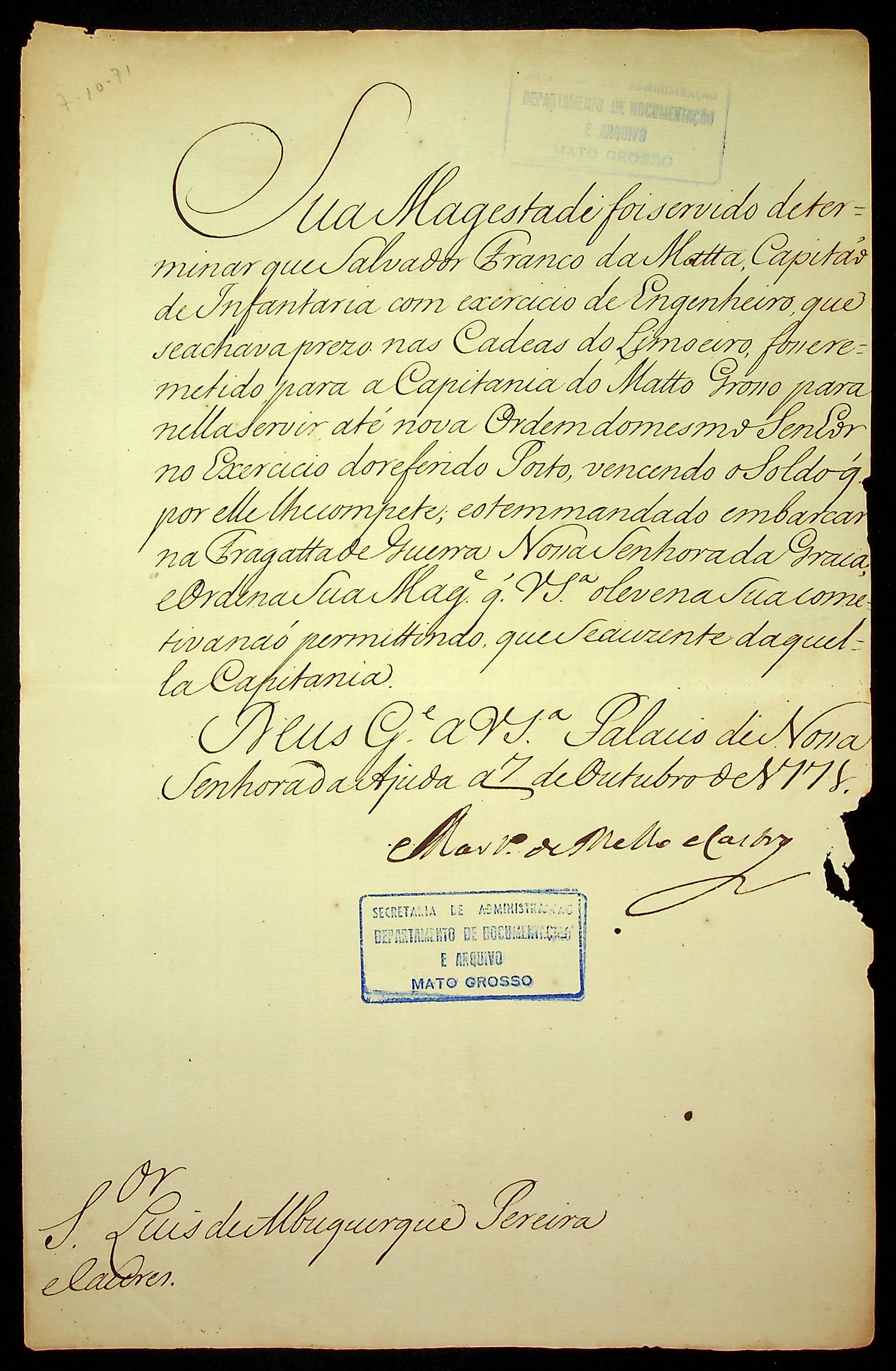 CARTA do [Secretário do Estado dos Negócios da Marinha e Ultramar] Martinho de Melo e Castro ao [Governador e Capitão General da Capitania de Mato Grosso] Luiz de Albuquerque Pereira de Melo e Cáceres.