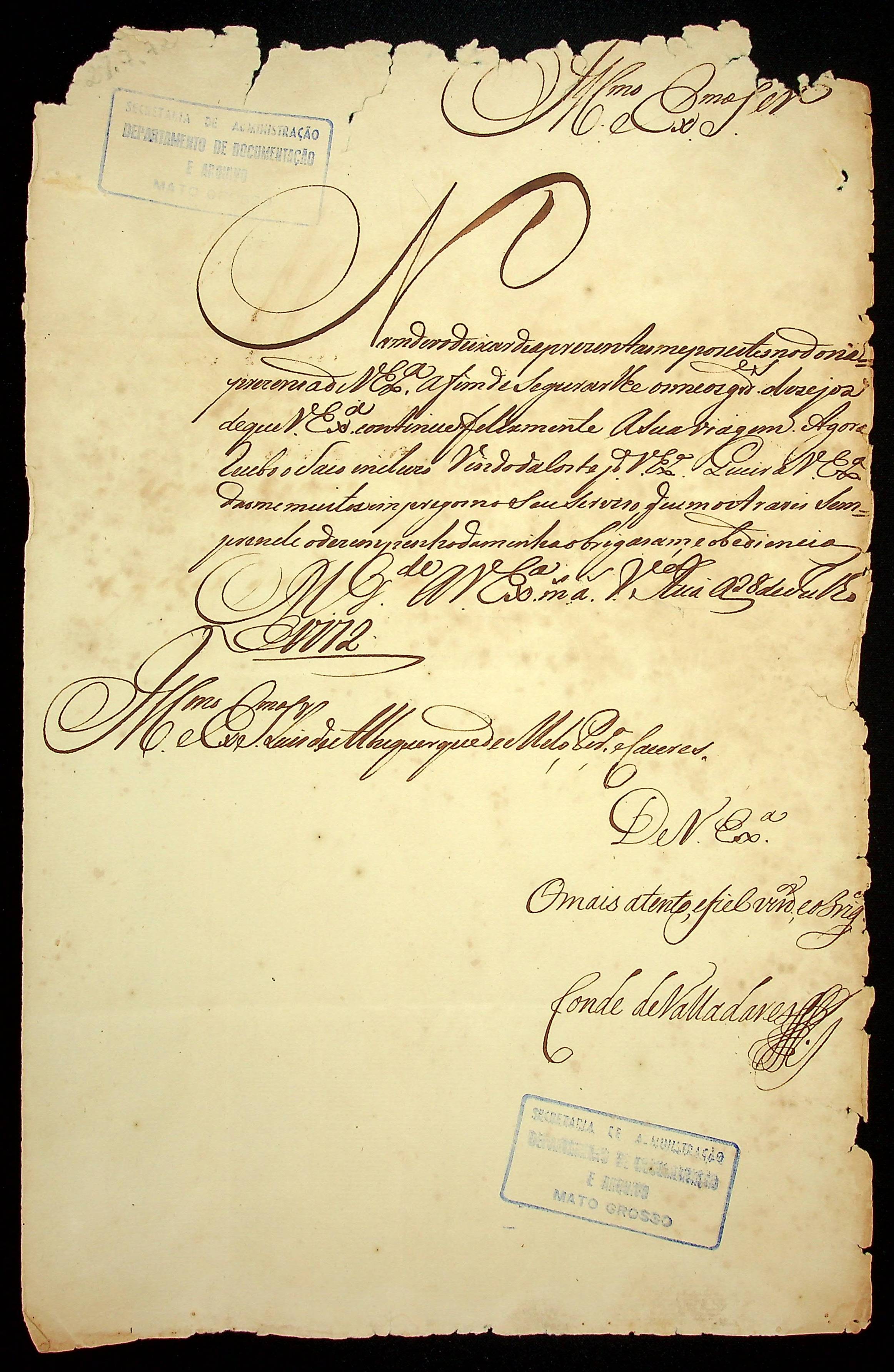 CARTA do Conde de Valladares á Luiz Albuquerque de Melo Pereira e Cáceres.