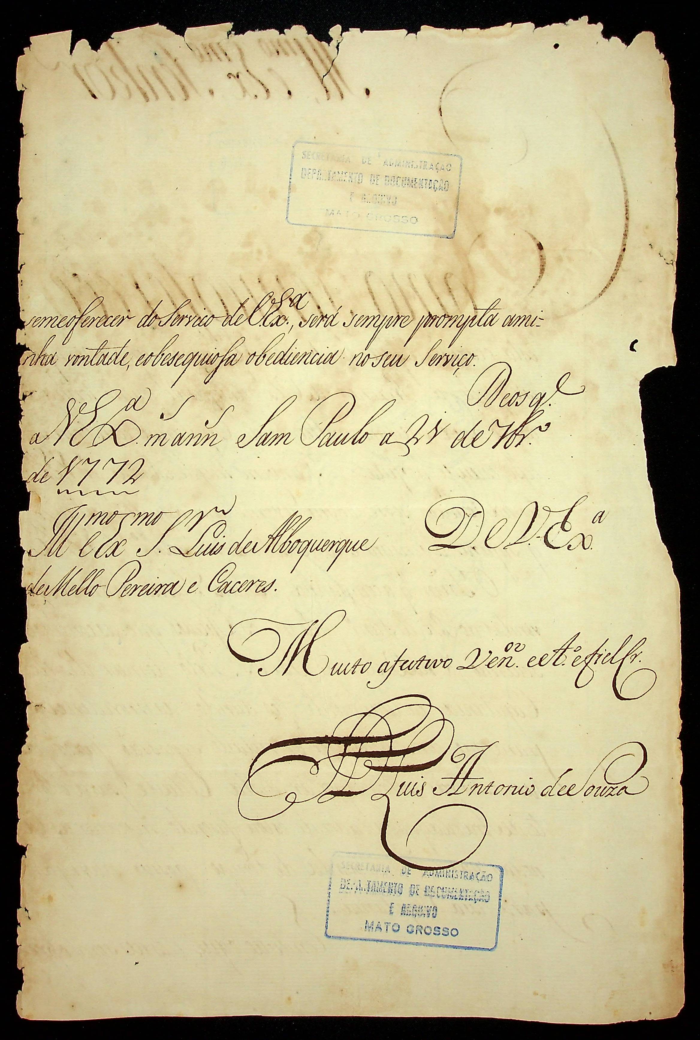 CARTA do [Governador e Capitão-General da Capitania de São Paulo] Luís Antônio de Souza Coutinho á Luiz de Albuquerque de Melo Pereira e Cáceres.