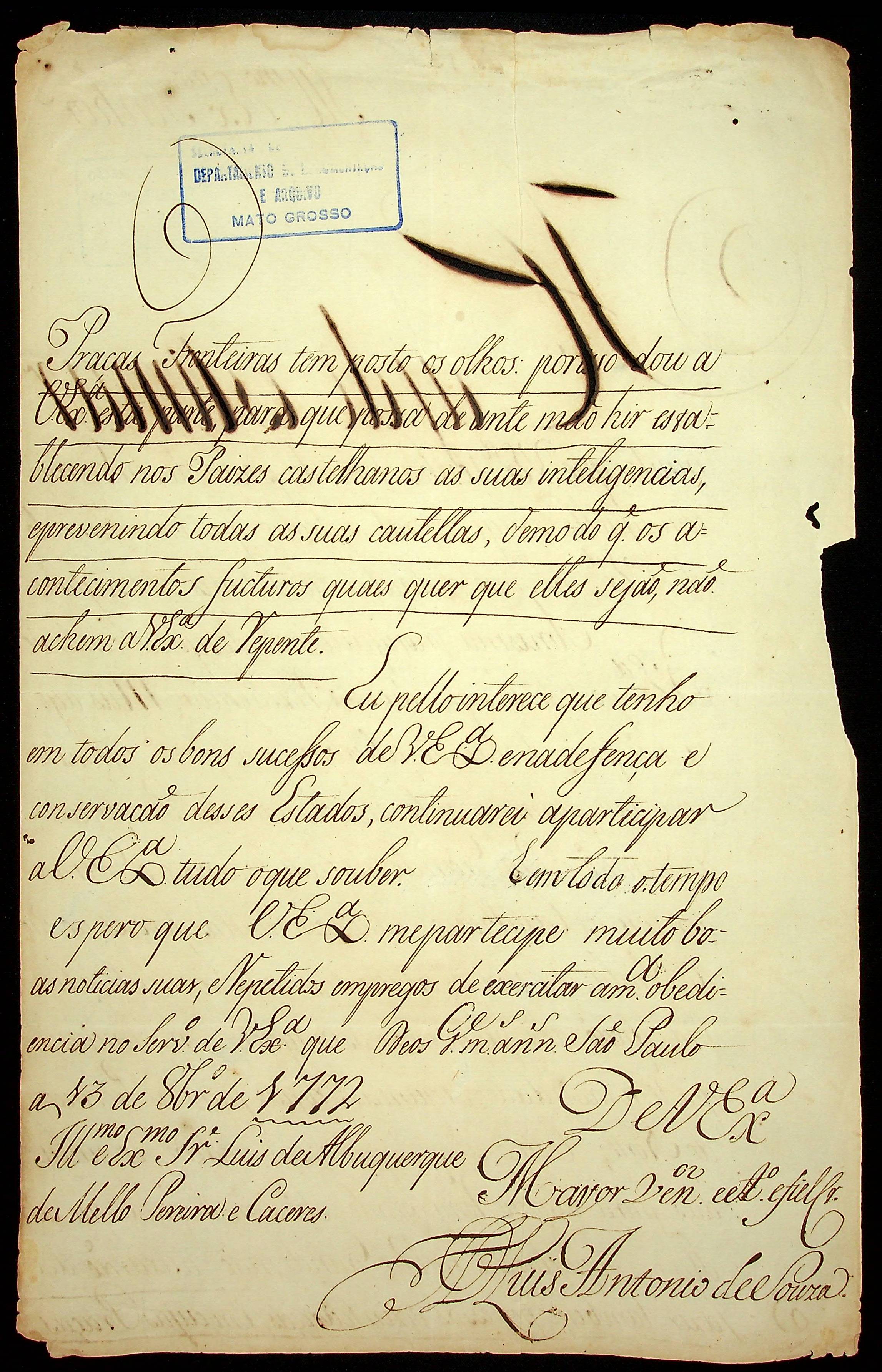 CARTA do [Governador e Capitão-General da Capitania de São Paulo] Luiz Antônio de Souza Coutinho ao [Governador e Capitão General da Capitania de Mato Grosso] Luiz de Albuquerque de Melo Pereira e Cáceres.