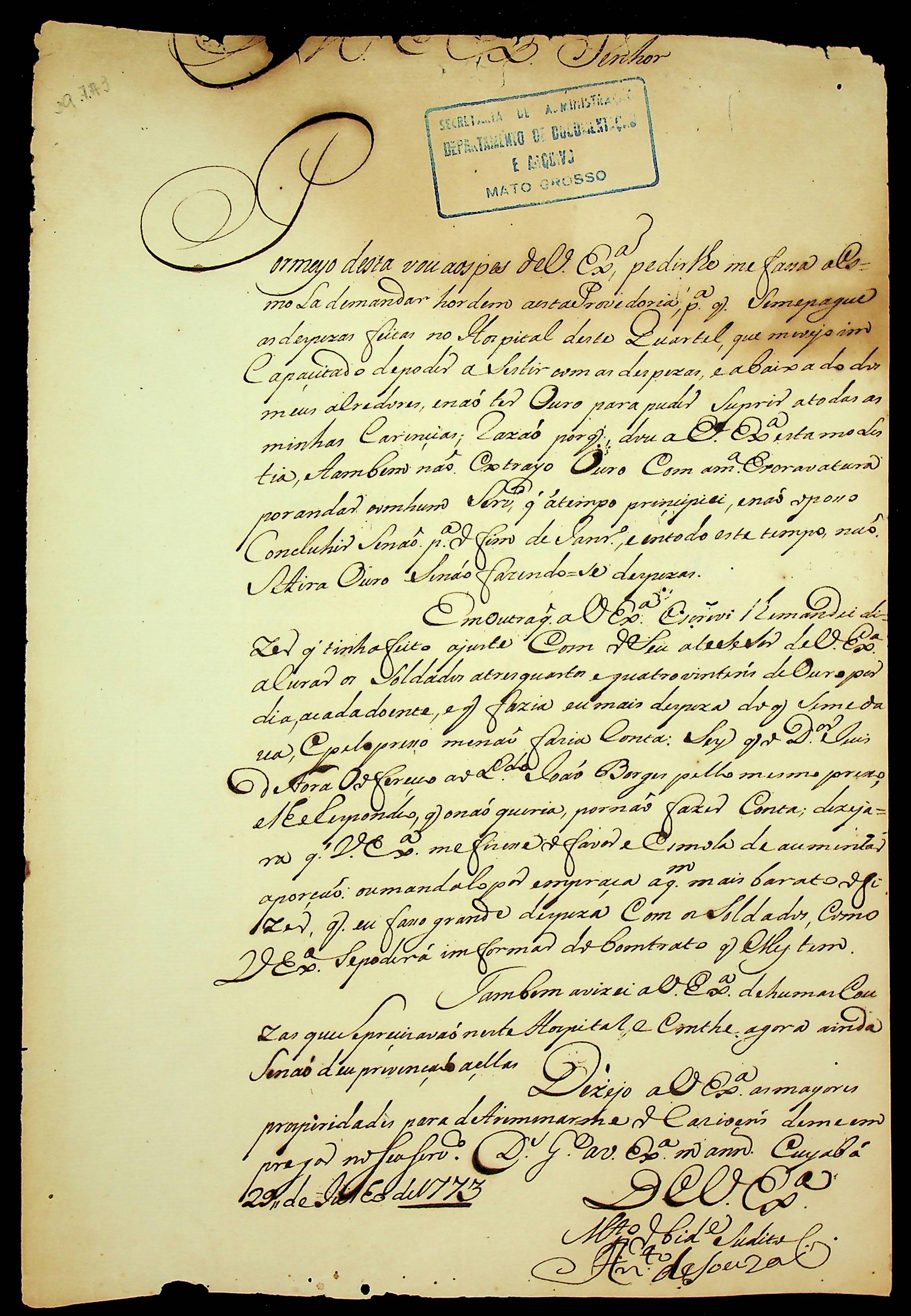 CARTA de Antônio de Souza ao [Governador e Capitão-General da Capitania de Mato Grosso Luís de Albuquerque de Melo Pereira e Cáceres].