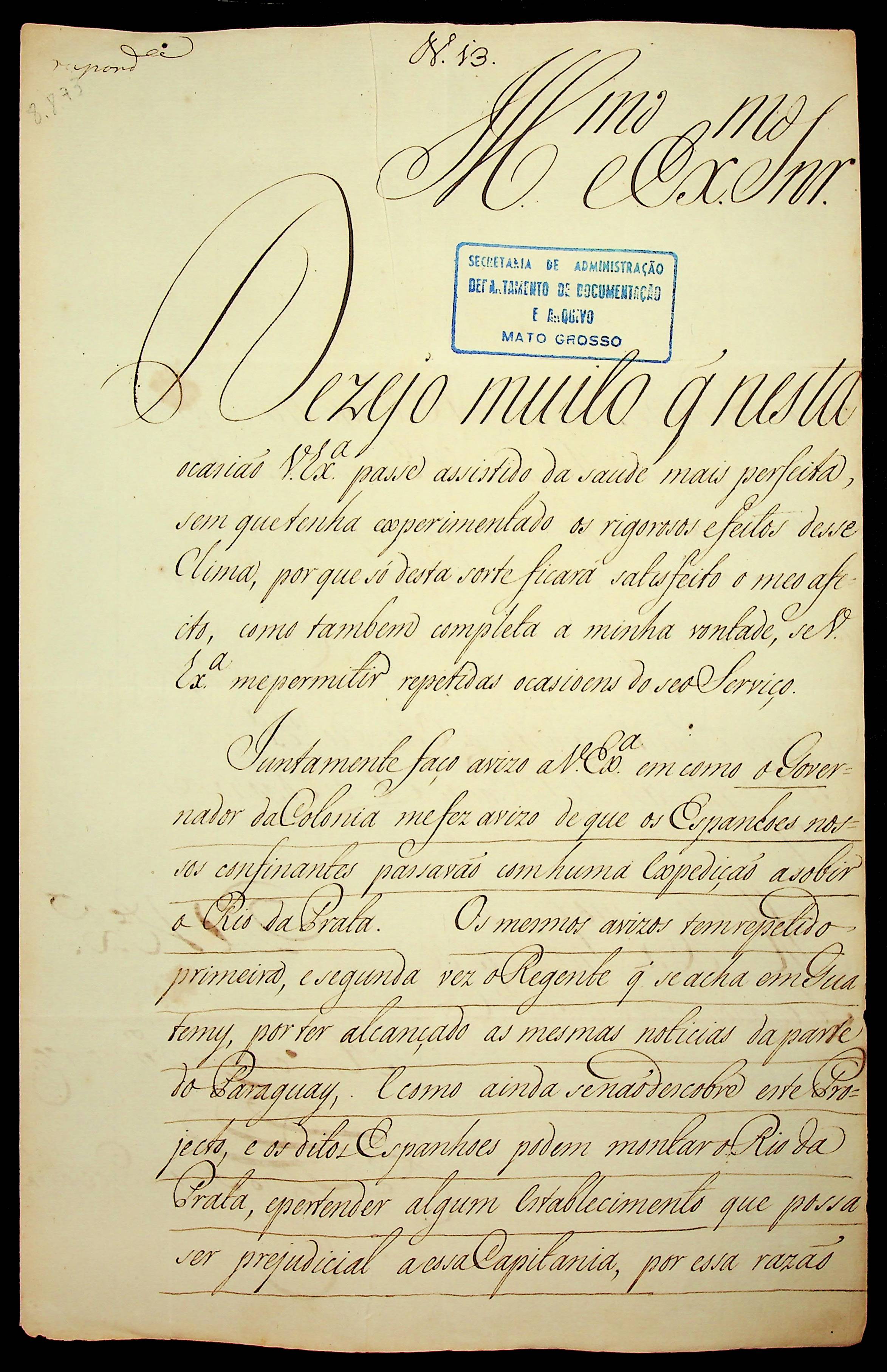 CARTA do [Governador e Capitão-General da Capitania de São Paulo] Luiz Antônio de Souza ao [Governador e Capitão General da Capitania de Mato Grosso] Luís de Albuquerque de Melo Pereira e Cáceres.