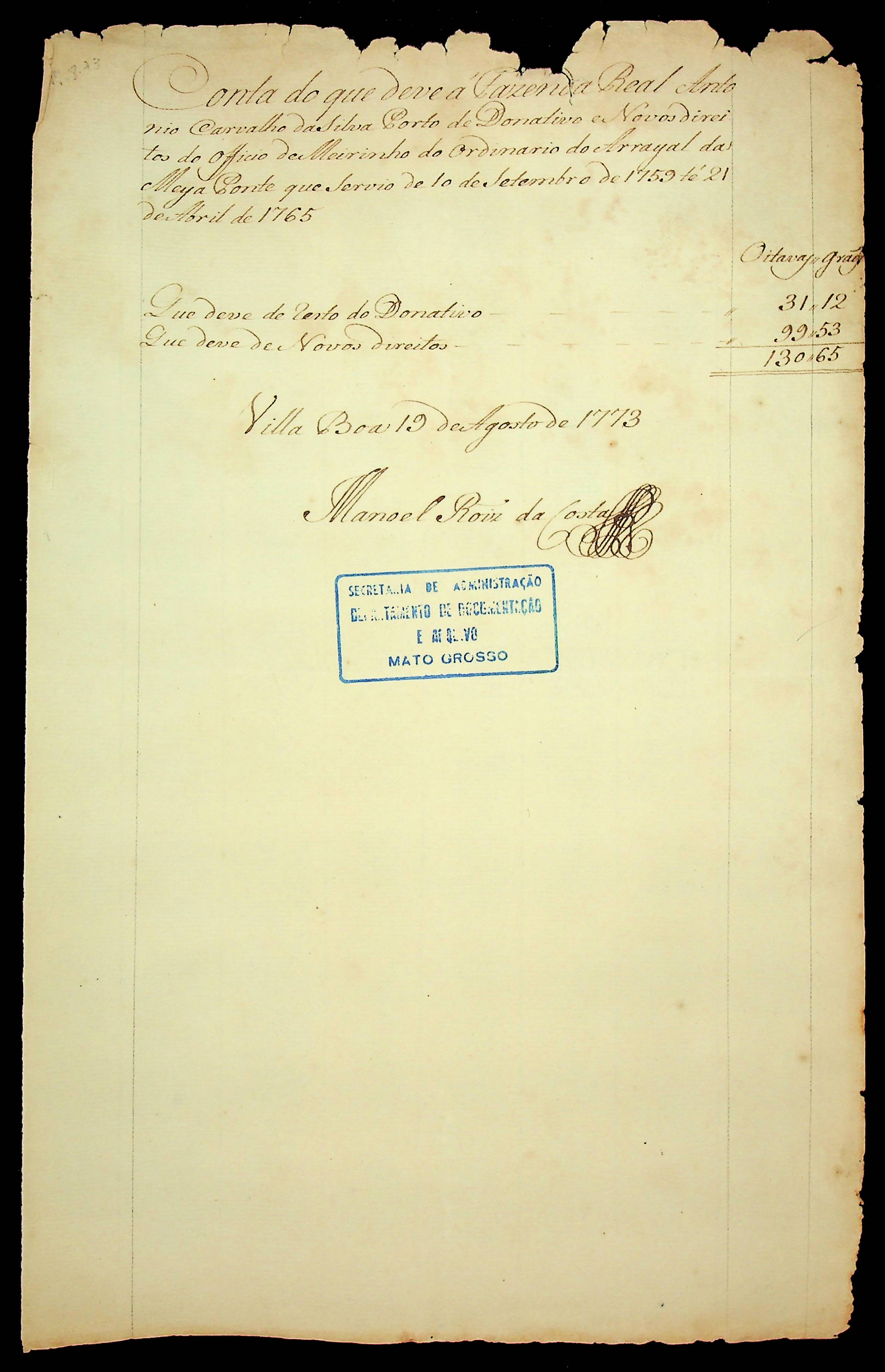 CARTA de Manoel Roiz da Costa ao [Governador e Capitão-General da Capitania de Mato Grosso Luís de Albuquerque de Melo Pereira e Cáceres].