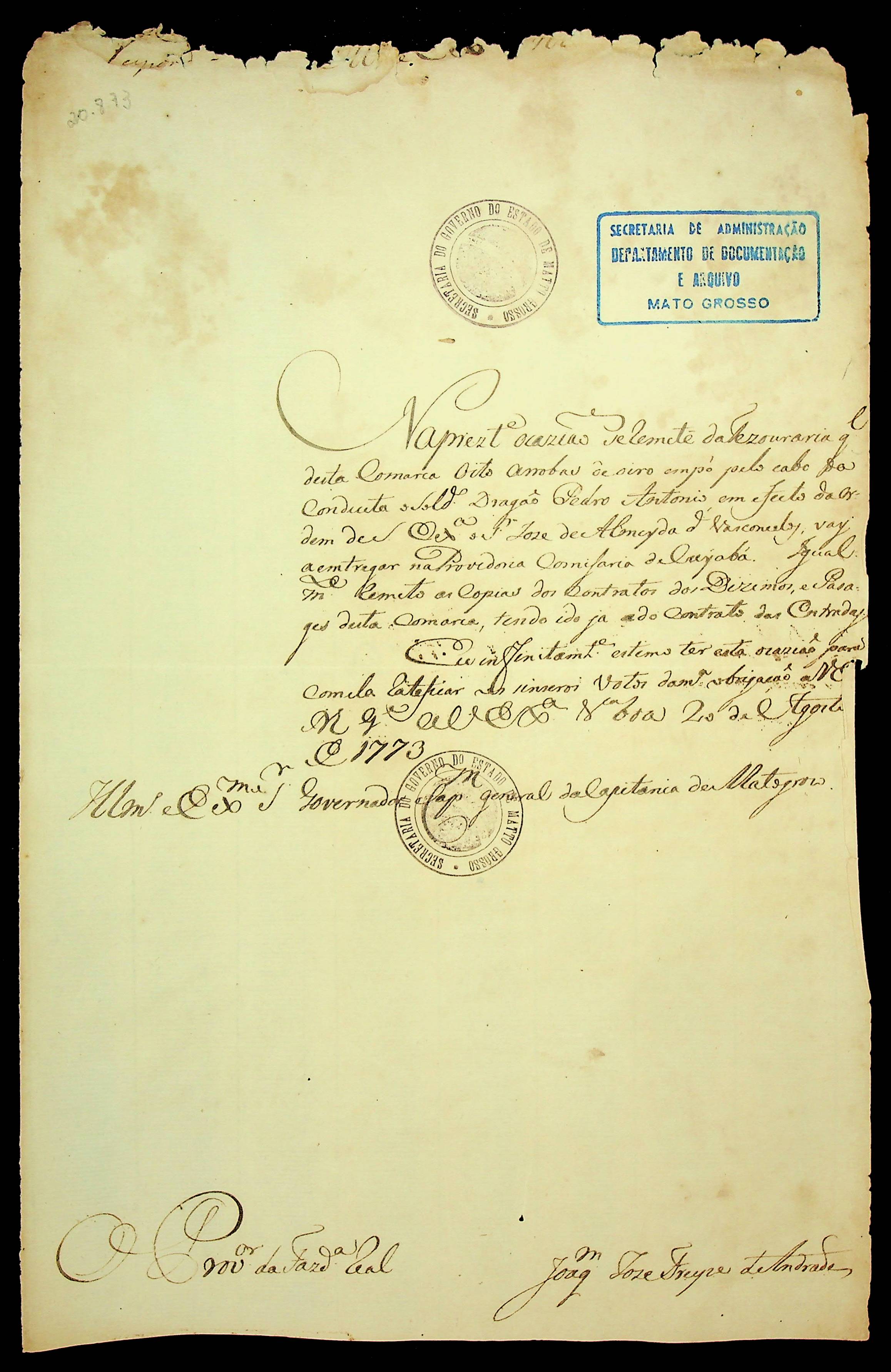 CARTA do Provedor da Fazenda Real Joaquim José Freire de Andrade ao Governador e Capitão-General da Capitania de Mato Grosso [Luís de Albuquerque de Melo Pereira e Cáceres].