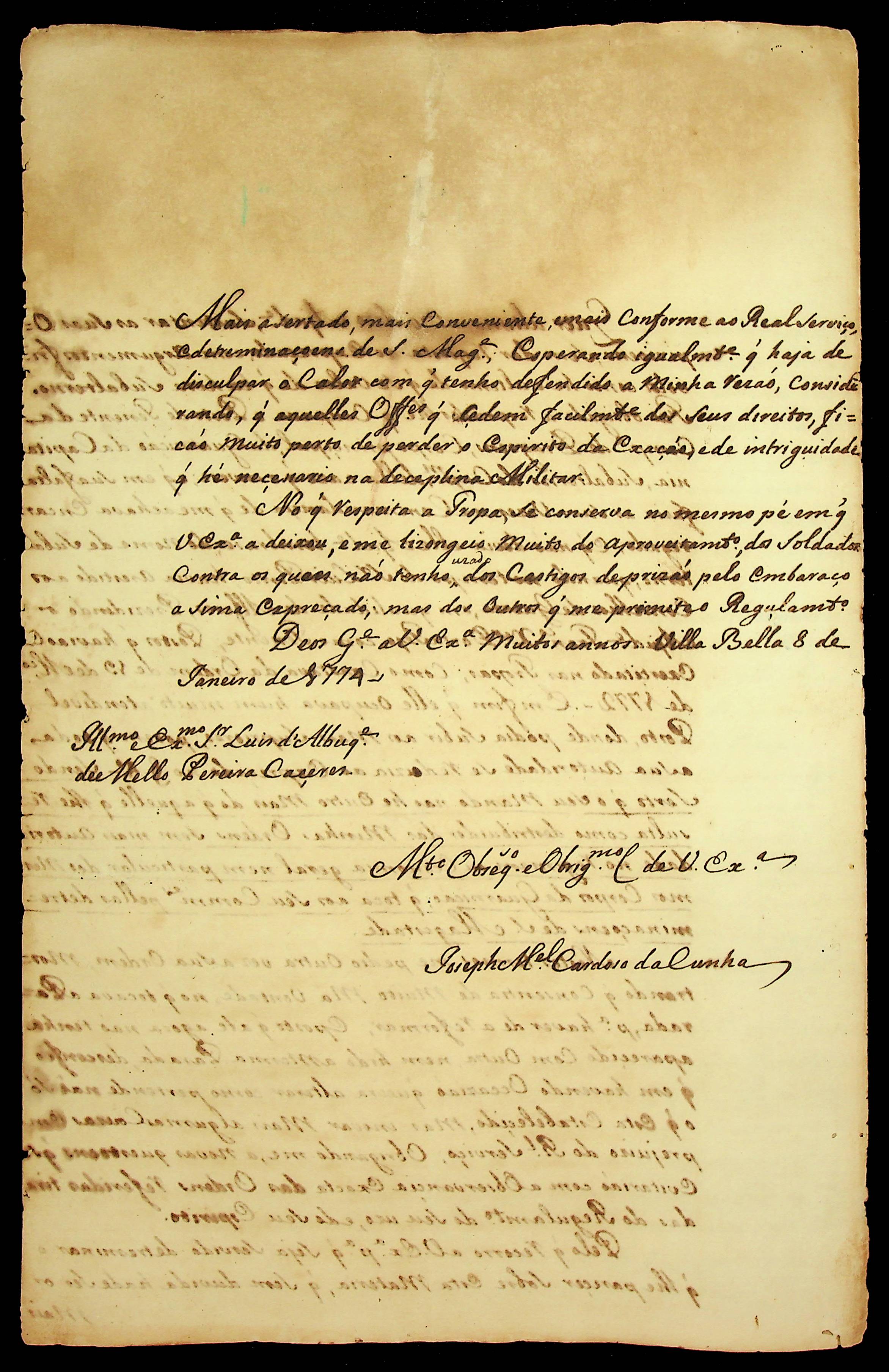 CARTA de Joseph Manoel Cardoso da Cunha ao [Governador e Capitão-General da Capitania de Mato Grosso] Luiz de Albuquerque de Melo Pereira e Cáceres.