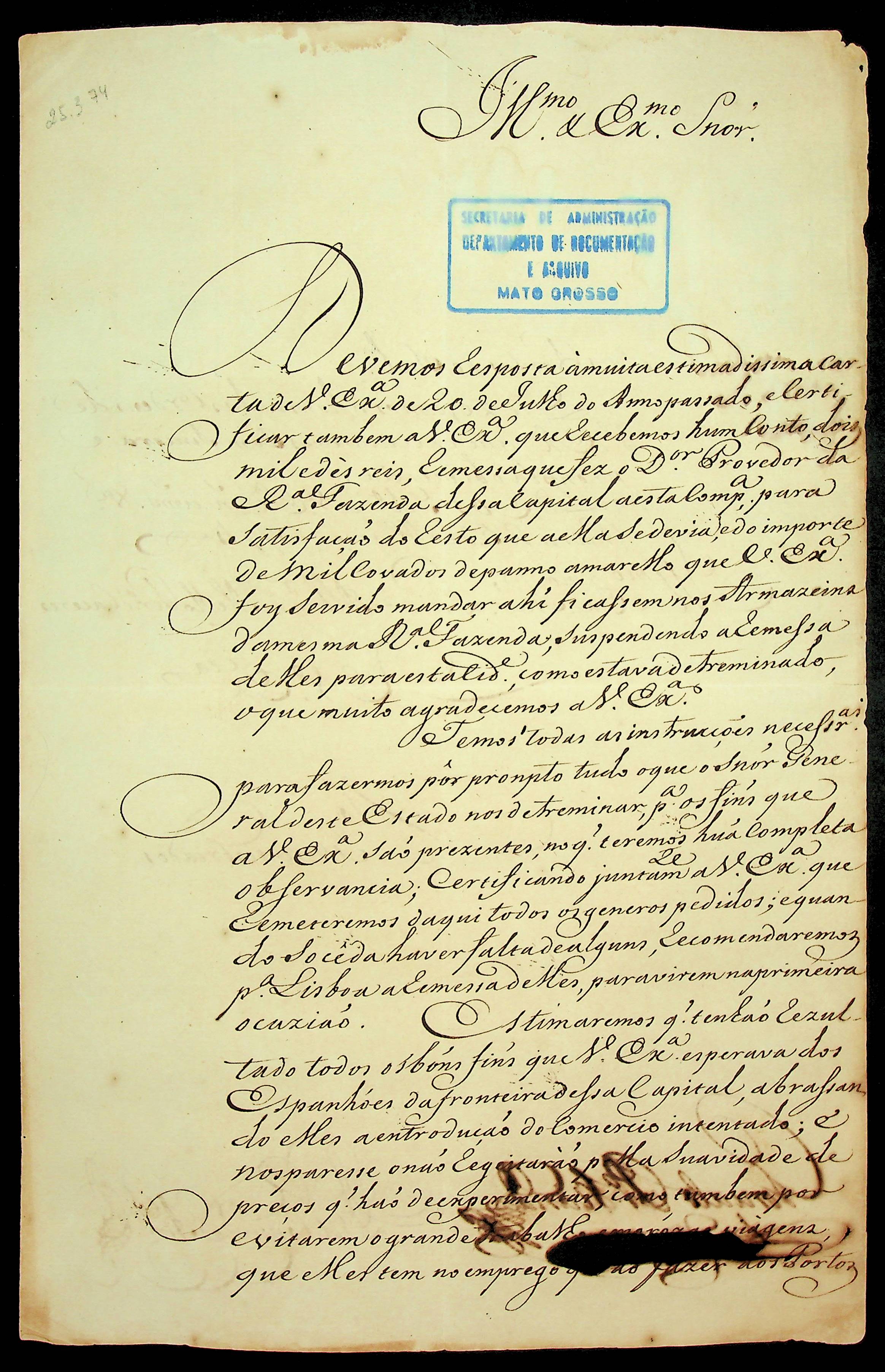 CARTA dos [Administradores da Companhia Geral de Comércio do Grão Pará e Maranhão] Gonçalo Pereira Viana e Antônio Coutinho de Almeida ao [Governador e Capitão-General da Capitania de Mato Grosso] Luiz de Albuquerque de Melo Pereira e Cáceres.