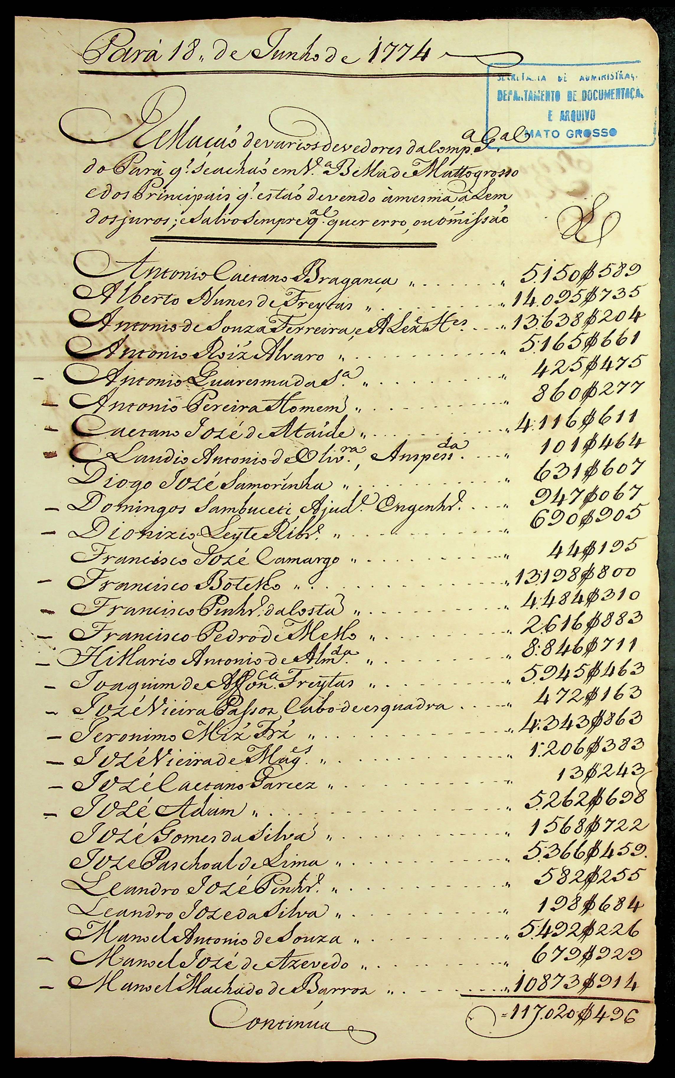 CARTA dos [Administradores da Companhia Geral de Comércio do Pará e Maranhão] Gonçalo Pereira Viana e Antônio Coutinho de Almeida ao [Governador e Capitão-General da Capitania de Mato Grosso] Luiz de Albuquerque de Melo Pereira e Cáceres.