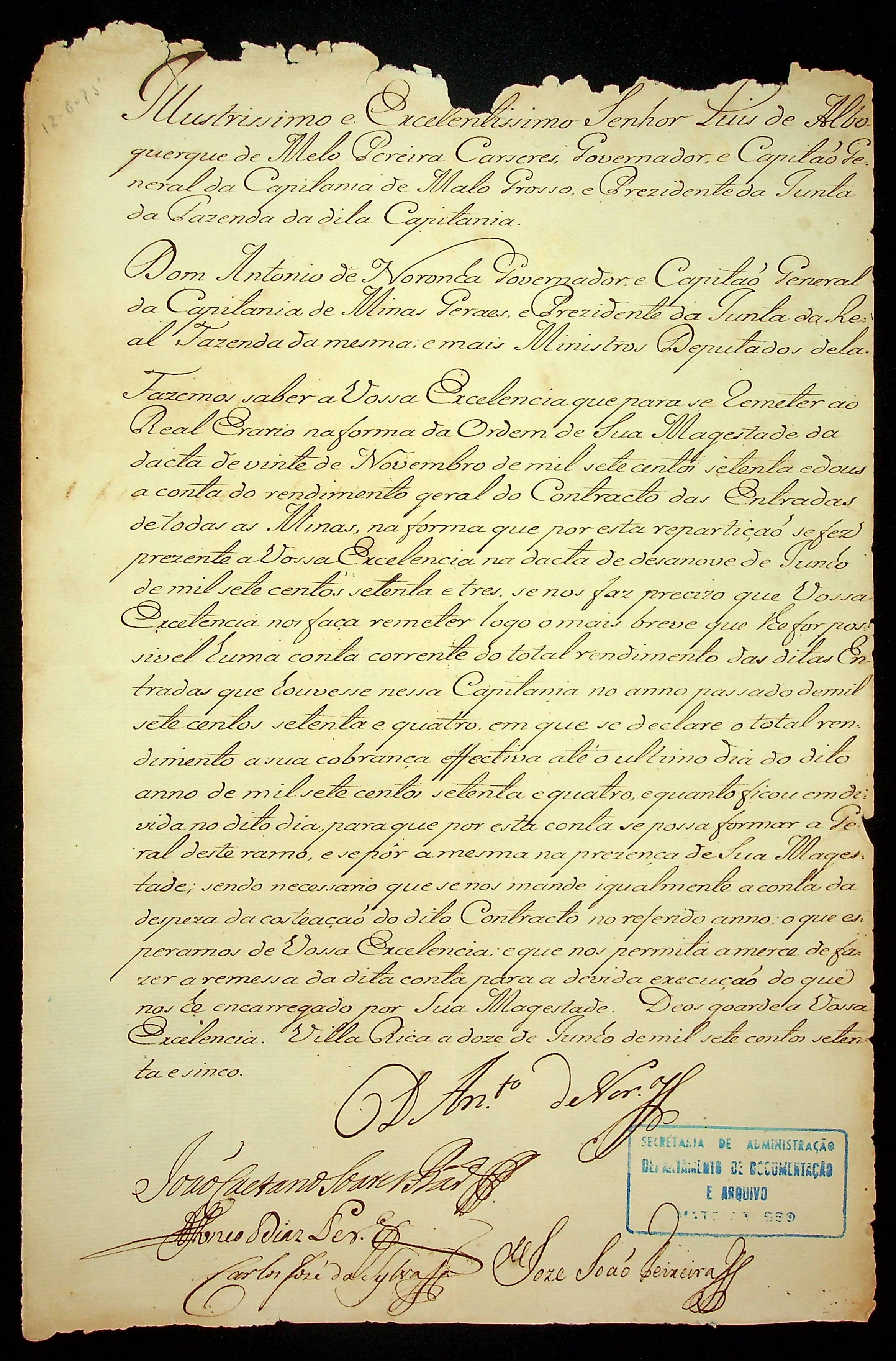 CARTA do Governador e Capitão-General da Capitania de Minas Gerais Dom Antônio de Noronha, ao Governador e Capitão-General da Capitania de Mato Grosso Luiz de Albuquerque de Melo Pereira e Cáceres.