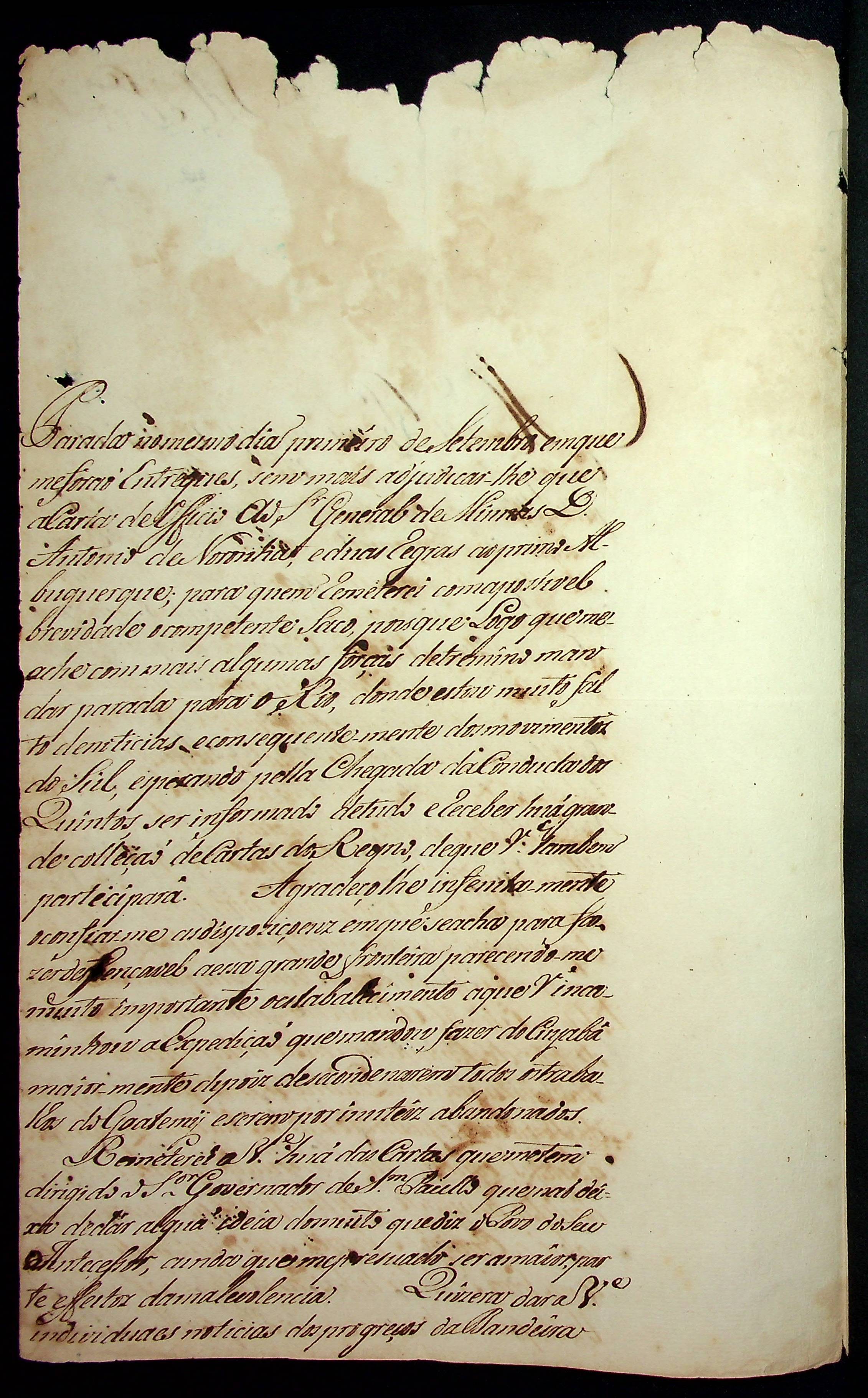 CARTA de [...] ao [Governador e Capitão-General da Capitania de Mato Grosso] Luiz de Albuquerque de Melo Pereira e Cáceres.