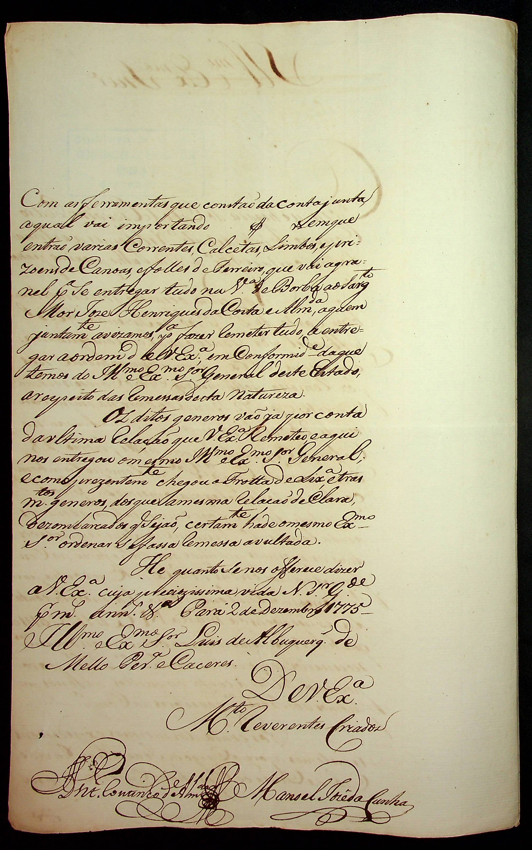 CARTA de Antônio Coutinho de Almeida e Manoel José da Cunha ao [Governador e Capitão-General da Capitania de Mato Grosso] Luiz de Albuquerque de Melo Pereira e Cáceres.