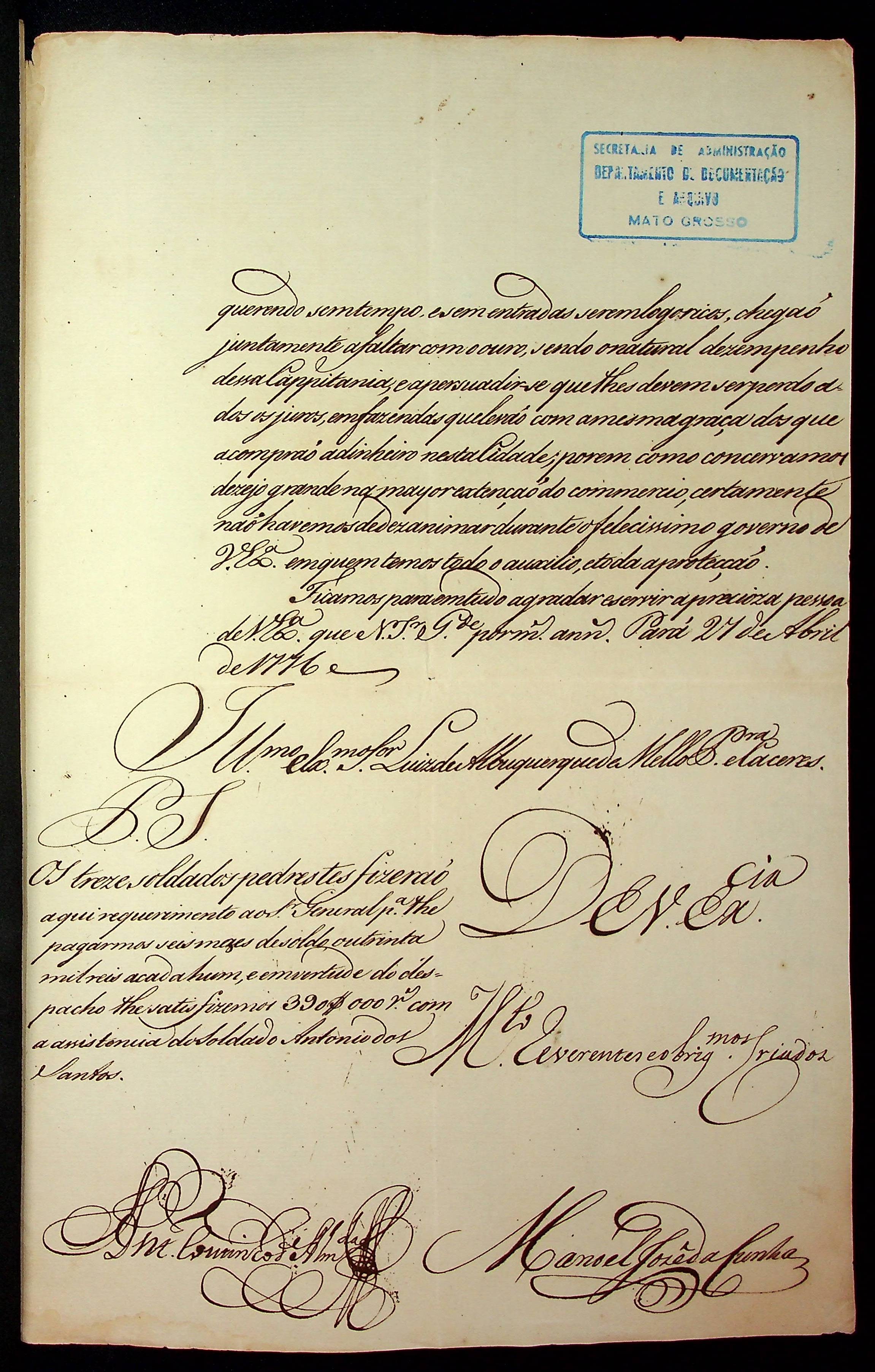 CARTA de Antônio Coutinho de Almeida e Manoel José da Cunha ao [Governador e Capitão-General da Capitania de Mato Grosso] Luiz de Albuquerque de Melo Pereira e Cáceres.