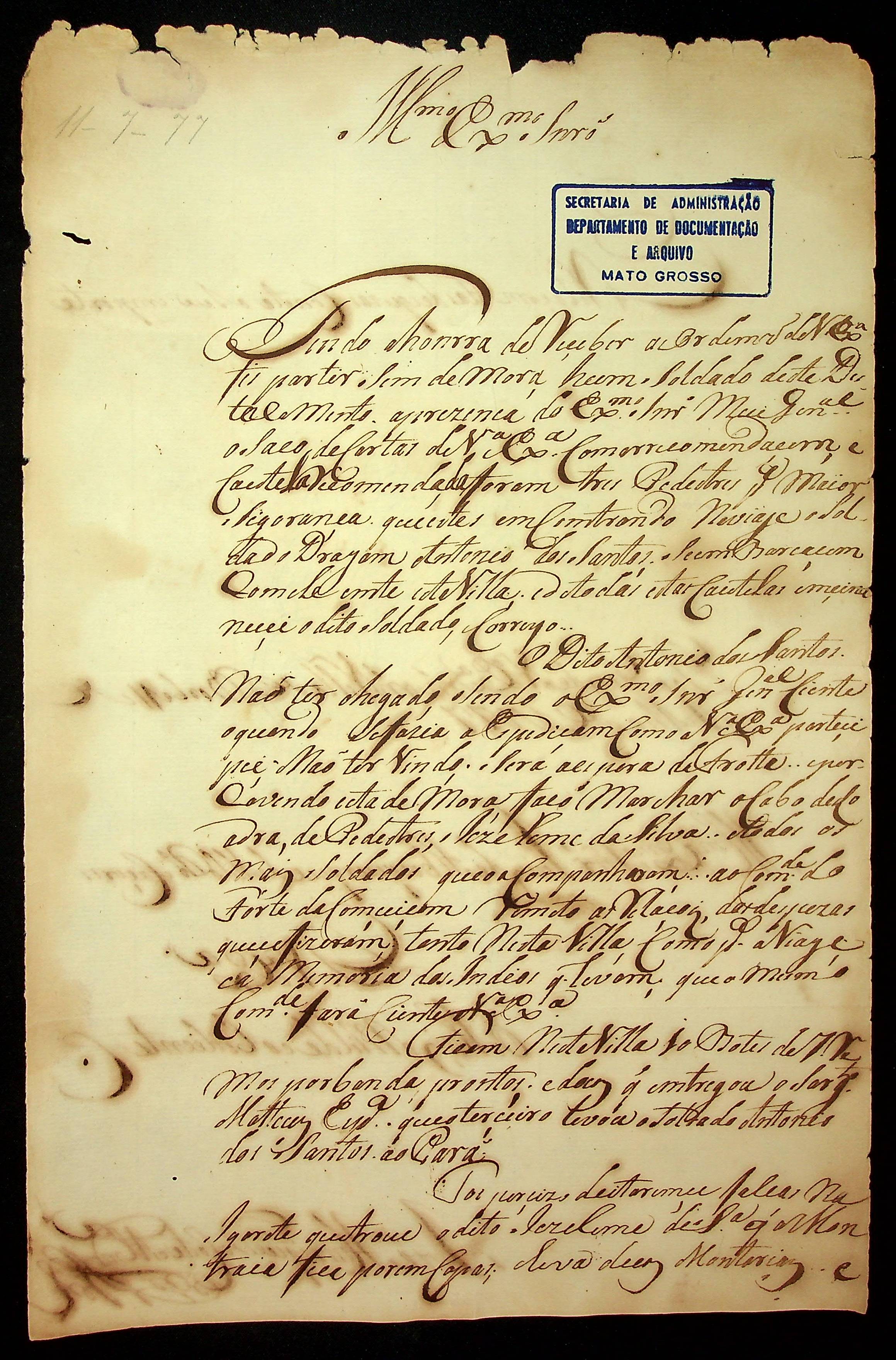 CARTA do [sargento mor] José Henrique da Costa Almeida ao [Governador e Capitão General da Capitania de Mato Grosso] Luiz de Albuquerque de Melo Pereira e Cáceres.