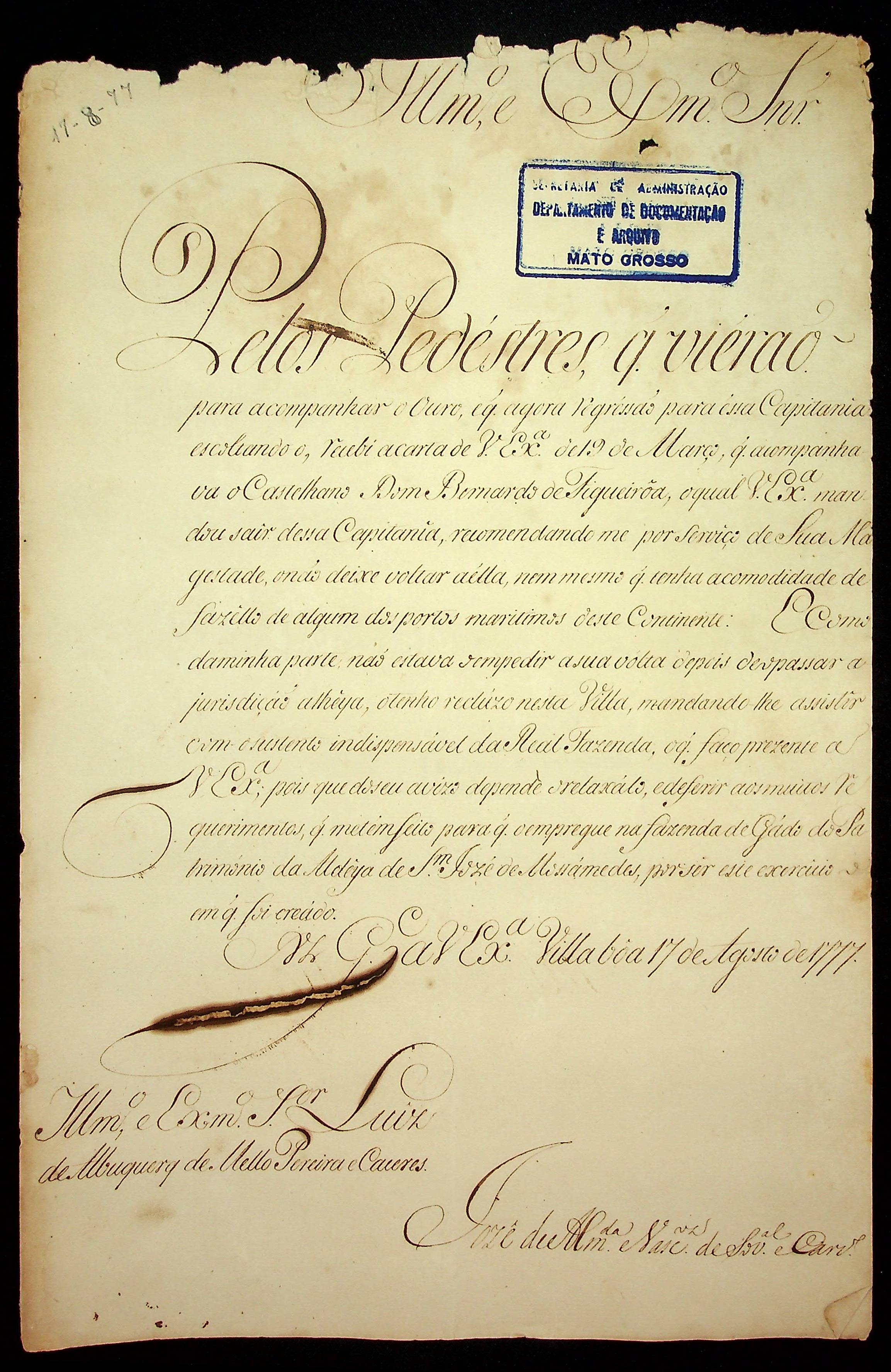 CARTA do [Governador e Capitão-General da Capitania de Goiás] José de Almeida Vasconcelos de Soveral e Carvalho, ao [Governador e Capitão-General da Capitania de Mato Grosso] Luiz de Albuquerque de Melo Pereira e Cáceres.