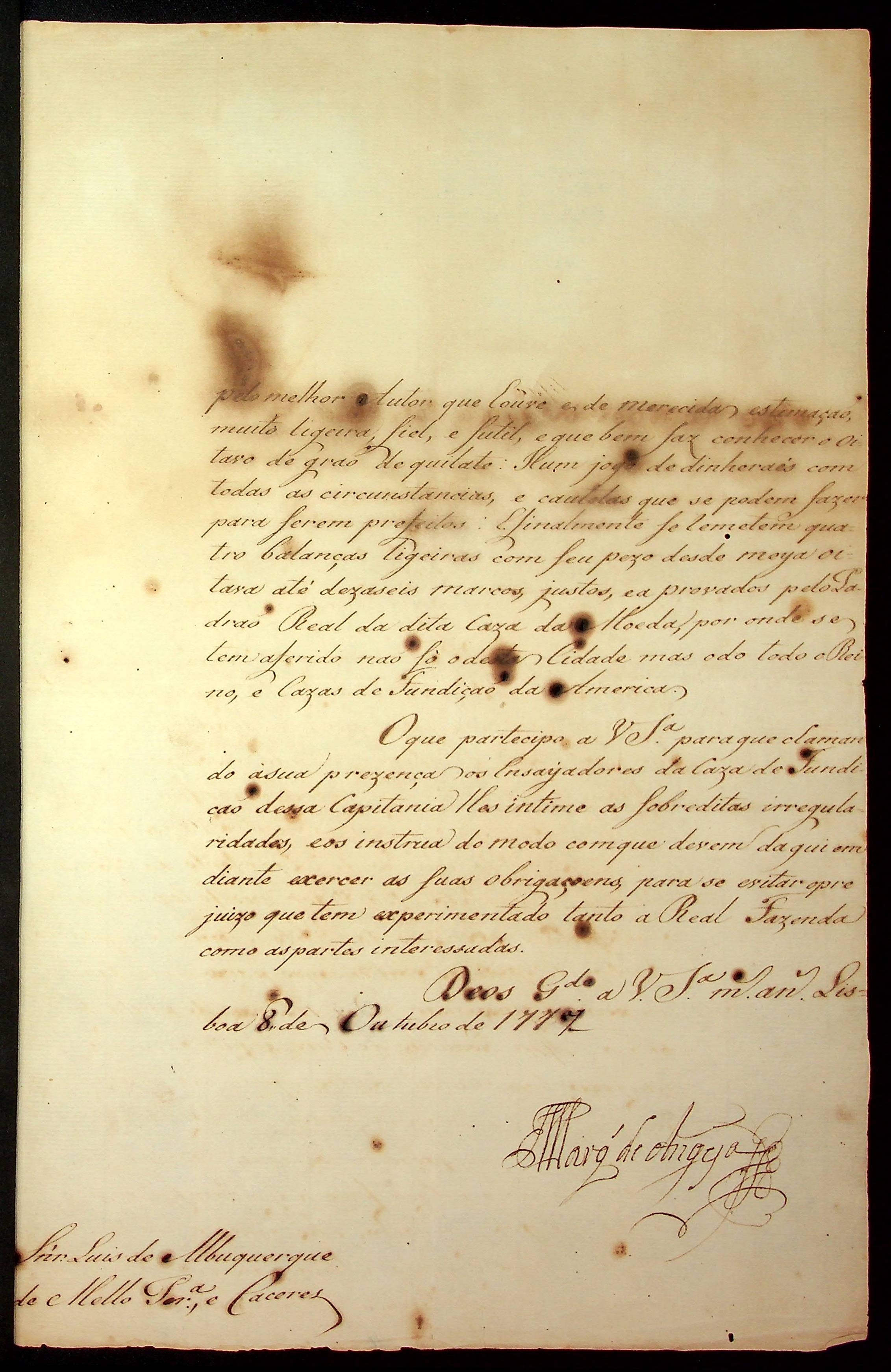 CARTA do Marques de [Angya] ao [Governador e Capitão-General da Capitania de Mato Grosso] Luiz de Albuquerque de Melo Pereira e Cáceres.